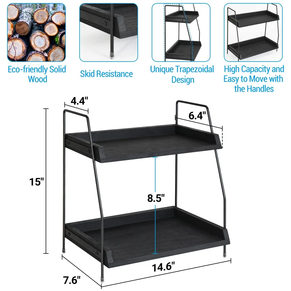 【MULTI-PURPOSE COUNTERTOP SHELF】2 tier design allows enough space to hold paper cups, coffee cups, tea bags, coffee bags, sugar packets, cookies, napkins and anything that needs to be organized. Also,It can be used as a condiment and spice rack organizer to store condiments, spices, cans and kitchen supplies in the kitchen ;btw, It can be used as a bathroom coutertop organizer to store bath towels, lotions, cosmetics and shampoo in the bathroom. 【COFFEE BAR ORGANIZER COUNTERTOP】This 2-tier coffee bar holder is perfect for storing coffee beans, sugar, instant coffee or coffee cups.Add more space to your pantry, kitchen, or dining room to store beverage condiments including creamer, sugar, coffee packets, ketchup mustard packets, and salt pepper packets, as well as cups, bowls, spoons, and more wait. The top shelf measures 14.6x6.4'', bottom shelf measures 14.6x7.6'' and the total height is 15”. Please enjoy your coffee time with it! 【BUILT TO LAST & SPACE SAVING】Are you troubled with the messy countertop due to coffee beans, kcups, cups and straws? Don't worry, our upgraded coffee rack can solve all of the problems. This coffee bar shelf organizer is made of metal and solid wood, lightweight and sturdy. The two-level design allows you to make better use any countertop or coffee area, perfect for the kitchen, office,breakroom, or catering, allowing you to find what you need at a glance. 【AMAZING GIFT IDEA】Best gift idea for parents, wife/ husband, daughter and friends. This coffee station organizer shelf with great looking, practical and amazing quality is a great gift for coffee lover on housewarming, Thanksgiving day, Christmas or birthday party, bringing a rustic and elegant atmosphere to any room.Perfect storage for countertop or table where space is limited. It is the best choice to save space and solve storage problems. 【EASY INSTALLATION & SATISFACTORY SERVICE】This countertop organizer is easy to install and clean.You will complete the installation within 5 minutes. Nothing matters more than your utmost satisfaction! We stand behind the quality and durability of our bathroom counter organizer. With our 100% Customer Satisfaction Guarantee, you can be sure of a great buying experience. Please feel free to contact us in case of any order-related issues. We will reply to you within 24 hours.