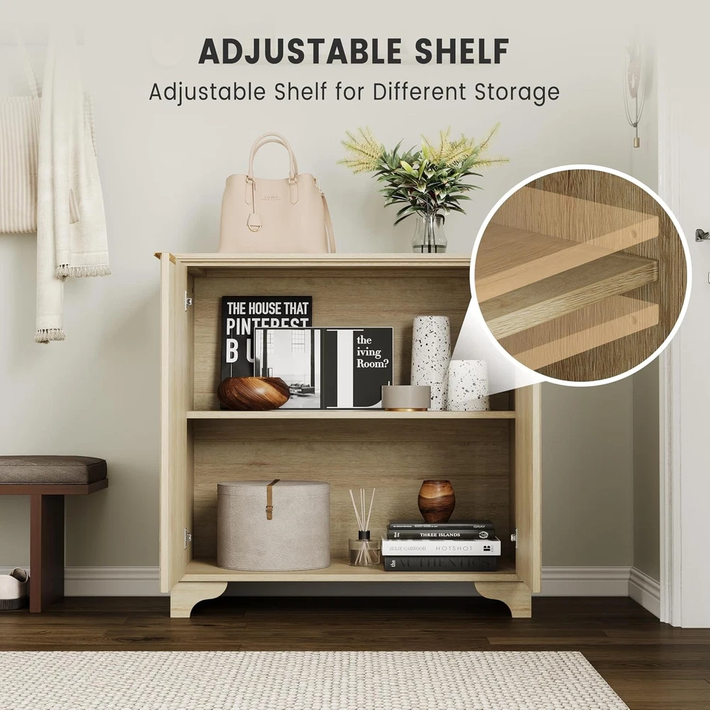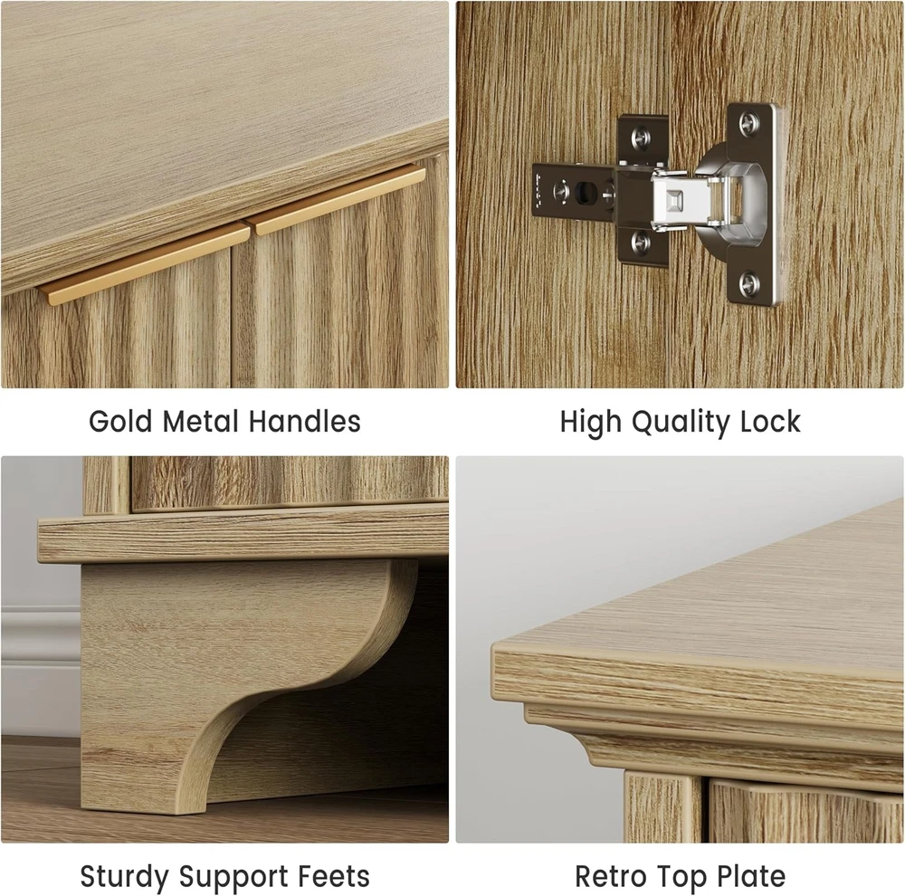 Product Description About this item • 【Spacious Storage】 This storage cabinet boasts generous dimensions of 15.7" D x 31.5" W x 31.5" H, providing ample space for various items. The spacious top surface offers a convenient area to display or access your belongings, while two bottom cabinets each feature adjustable shelves, cleverly accommodating cups, extra dinnerware, and other essentials • 【Multifunctional Cabinet】Whether you're seeking for a farmhouse sideboard to keep tableware organized, an extra storage cabinet to tuck away all your odds and ends, a coffee bar to serve your leisure time, or a TV stand to hold the CD player, it's an essential furniture piece that any kitchen, dinning room, entryway or living room would love • 【Modern Farmhouse Charm】Combining impressive fluted wood grain with a sleek white finish, this storage cabinet seamlessly blends farmhouse aesthetics with classic modern design. The gold metal handles add a touch of luxury, making it easy to integrate into various interior styles, from rustic cottages to contemporary and traditional decors • 【Durable & Safe】Constructed from high-quality MDF with a sleek laminate finish, this buffet cabinet is both durable and easy to clean. The water-resistant and stain-resistant surface ensures long-lasting use. An anti-tip kit is included for added safety, making it ideal for homes with children or pets • 【Easy Assembly】The farmhouse storage cabinet comes with step-by-step instructions and labeled parts for easy assembly. We are committed to providing excellent service. If you have any pre-sale and after-sale questions, please contact us without any hesitation, we will respond in less than 24 hours Coffee Bar Cabinet, Modern Farmhouse Kitchen Storage Cabinet with Fluted Doors, Sideboard Buffet Cabinet with Adjustable Shelves, for Kitchen, Dining Room, Living Room, Oak On Aug 12, 2025 at 00:31:20 PDT, seller added the following information: