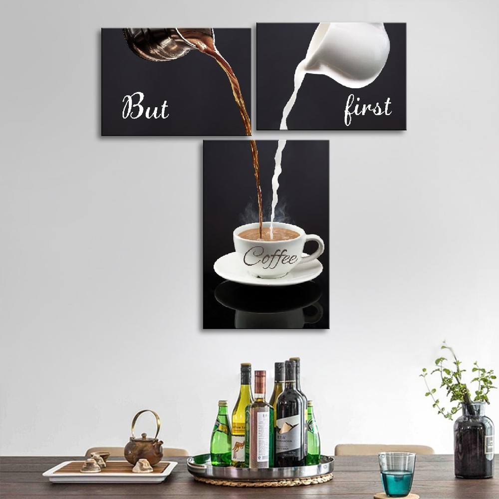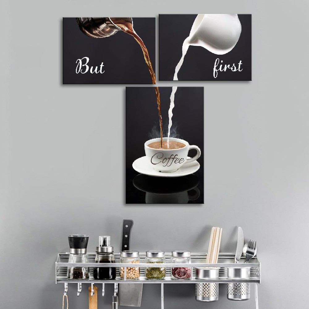 Coffee Bar Wall Decor for Kitchen - But First Coffee Sign - Kitchen Canvas Wall Art for Modern Home Dining Room Decorative (latte-set, Set of 3) Product Details Color: latte-set Brand: Pinetree Art MPN: Does not apply UPC: Does not apply EAN: Does not apply Item Weight: 1.1 Pounds Item Dimensions L x W: 14"L x 9.5"W Room Type: Kitchen Pattern: Letter Print Wall Art Form: Wall Hanging Decor Color: latte-set Style Name: Modern Orientation: Landscape Item Shape: Rectangular Theme: Coffee,Modern Kitchen Paint Type: Wood Cover Material: Canvas Paper Finish: Matte Frame Material: Wood Material Type: Wood Recommended Uses For Product: Kitchen decoration, Coffee bar or dining room decoration, Modern home or dining room decoration Manufacturer: Pinetree Art Number of Items: 3 Brand: Pinetree Art Mounting Type: Wall Mount Frame Type: Wrapped Canvas Size : a set featuring 2 wrapped canvas prints at 10 x 7 inches, 1 at 9.5 x 14 inches. Made of top quality canvas , stretched with solid wood frame. Are you looking for something different and fun for your coffee bar? Complement your home with this cutest coffee sign Easy To Install: Comes ready for wall mount; no additional hanging hardware required. Each panel is wrapped by plastic bag for safe protection. A blessed gift to the person you cherish for housewarming, wedding, anniversary, Thanksgiving, Christmas, Mother's Day, Father's Day, Valentine's Day, Birthday. PLEASE NOTE: EVERY ART PIECE IS UNIQUE. The appearance may vary from web picture due to hand painting effects and size difference. Please contact us if you are unsatisfied with any aspects of our product and services. We will try our best to help. This funny original design coffee bar wall decoration sign is made of high- quality canvas and solid wood frame. Product material: canvas and wood; product size: 10 x 7 inch x 2 and 9.5 x 14 inch, due to manual measurement, please allow a slight size error