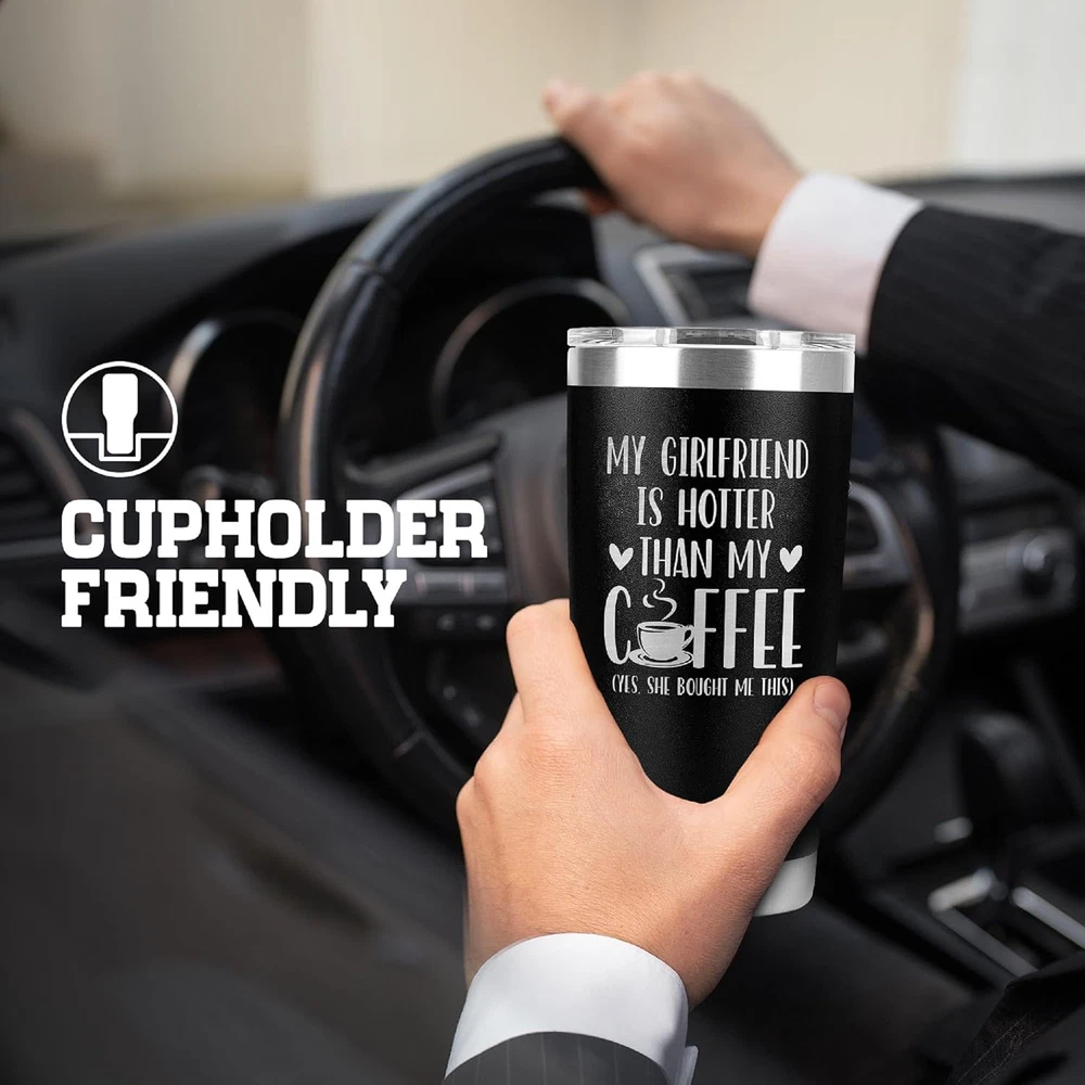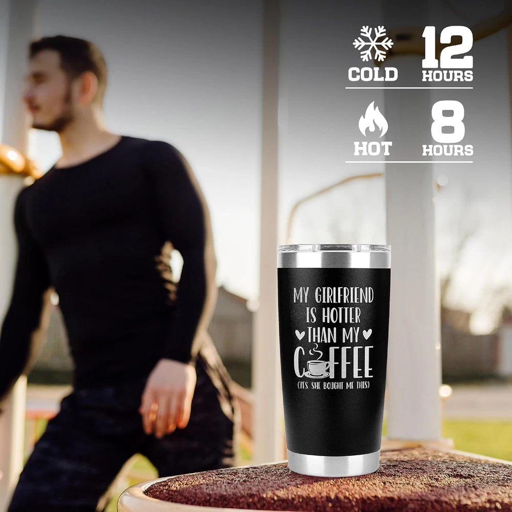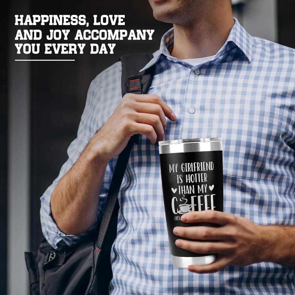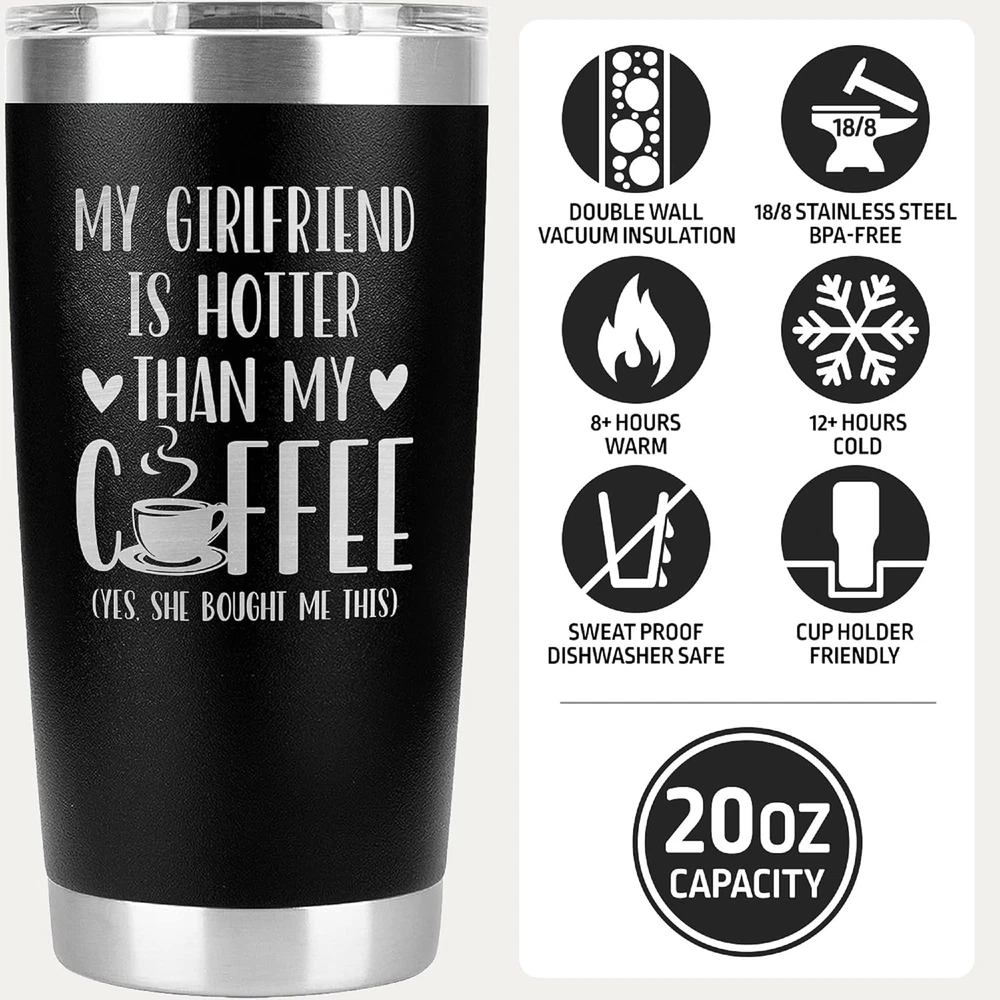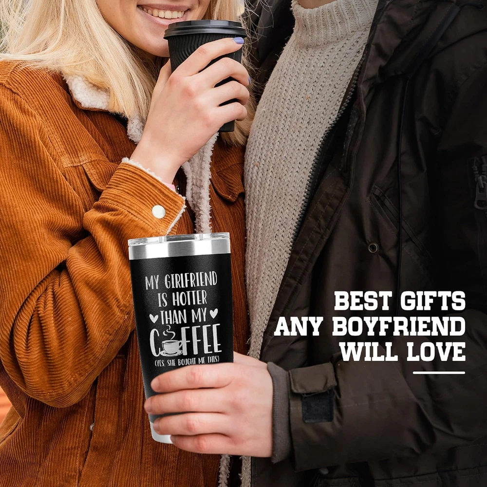 ✅ ROMANTIC BOYFRIEND GIFT: Surprise your boyfriend/husband with this charming coffee tumbler – a perfect way to express your love on special occasions such as anniversaries, birthdays, engagements, Valentine's Day, and Christmas, or simply to show your affection ✅ ANNIVERSARY GIFT FOR YOUR LOVE: This tumbler will add color to his life, letting him know how important he is to you. Ideal for meaningful day gifts for boyfriend, best boyfriend ever, coffee cup for him, gifts for new boyfriend, 6 month anniversary for boyfriend, funny gifts for boyfriend ✅ COFFEE TUMBLER FOR HIM: Make his day become more special with this great tumbler! Thank him for all the wonderful things he has done for you with this gift from a girlfriend. Our funny gifts for a boyfriend are sure to put a smile on his face and make him feel your love and care ✅ PREMIUM QUALITY: Our tumblers for women are made with premium, durable materials — a combination of heavy-duty, non-BPA stainless steel and plastic. Suitable for use in any indoor or outdoor setting ✅ DOUBLE-WALLED INSULATION TUMBLER: Say goodbye to cold coffees or excessively hot lemonades with this coffee tumbler for women! Featuring double-walled vacuum insulation, this tumbler keeps your favorite drinks hot or cold for many hours, allowing you to enjoy every sip! ✅ ROMANTIC BOYFRIEND GIFT: "My Girlfriend Is Hotter Than My Coffee" - Surprise your boyfriend/husband with this charming coffee tumbler – a perfect way to express your love on special occasions such as anniversaries, birthdays, engagements, Valentine's Day, and Christmas, or simply to show your affection ✅ ANNIVERSARY GIFT FOR YOUR LOVE: This tumbler will add color to his life, letting him know how important he is to you. Ideal for valentines day gifts for boyfriend, best boyfriend ever, coffee cup for him, gifts for new boyfriend, 6 month anniversary for boyfriend, funny gifts for boyfriend ✅ VALENTINE'S DAY GIFTS FOR HIM: Make his Valentine's Day special with this boyfriend gift. Thank him for all the wonderful things he has done for you with this Valentine's Day gift from a girlfriend/wife. Our funny gifts for a boyfriend/husband are sure to put a smile on his face and make him feel your love and care ✅ PREMIUM QUALITY: Our tumblers for women are made with premium, durable materials — a combination of heavy-duty, non-BPA stainless steel and plastic. Suitable for use in any indoor or outdoor setting ✅ DOUBLE-WALLED INSULATION TUMBLER: Say goodbye to cold coffees or excessively hot lemonades with this coffee tumbler for women! Featuring double-walled vacuum insulation, this tumbler keeps your favorite drinks hot or cold for many hours, allowing you to enjoy every sip!