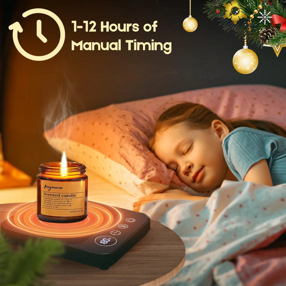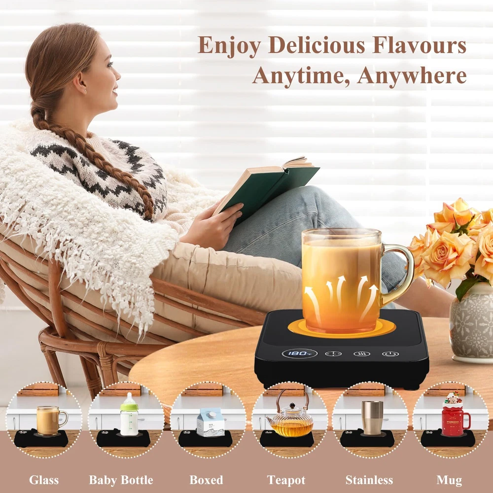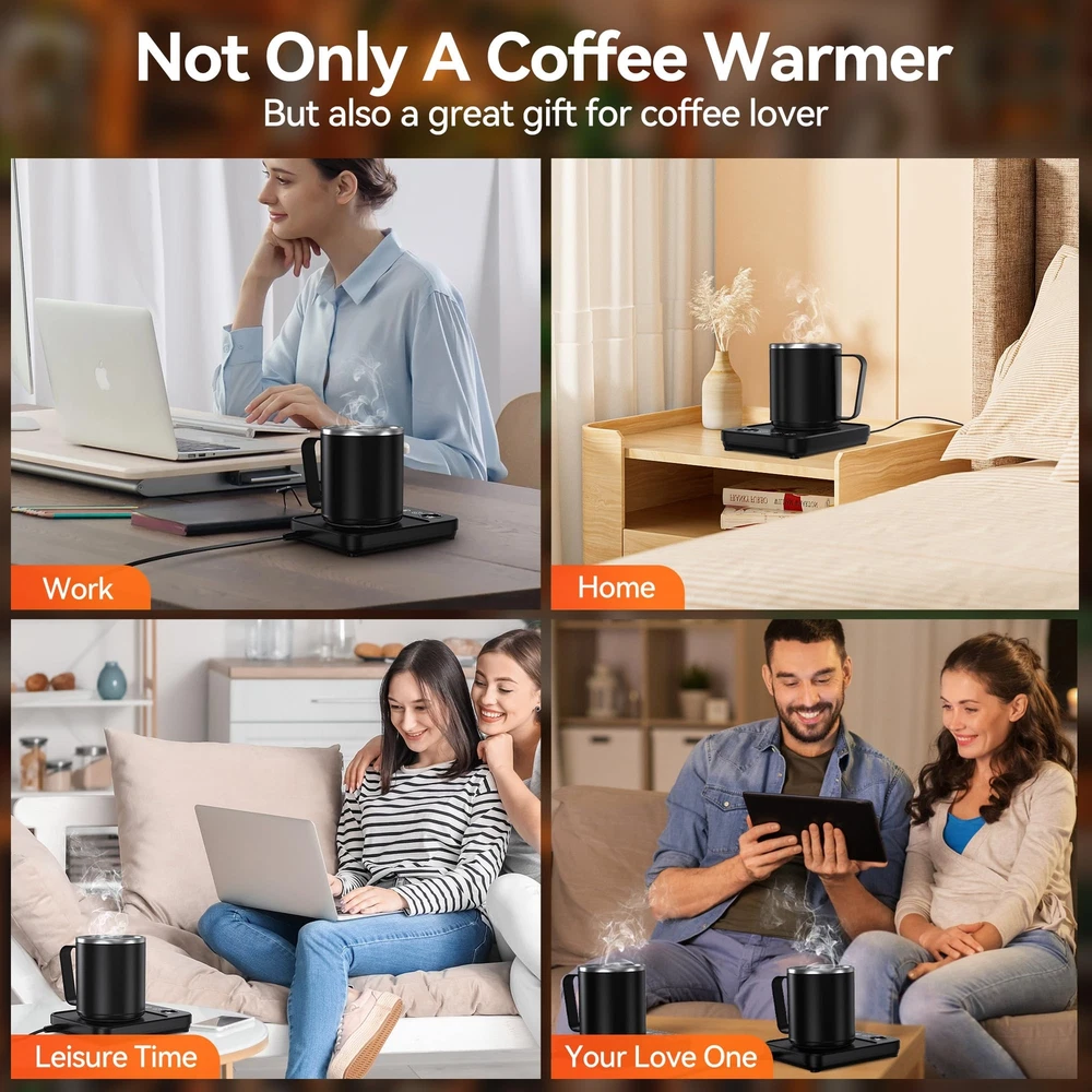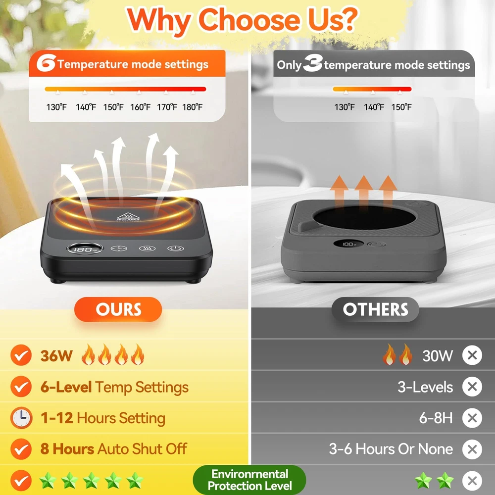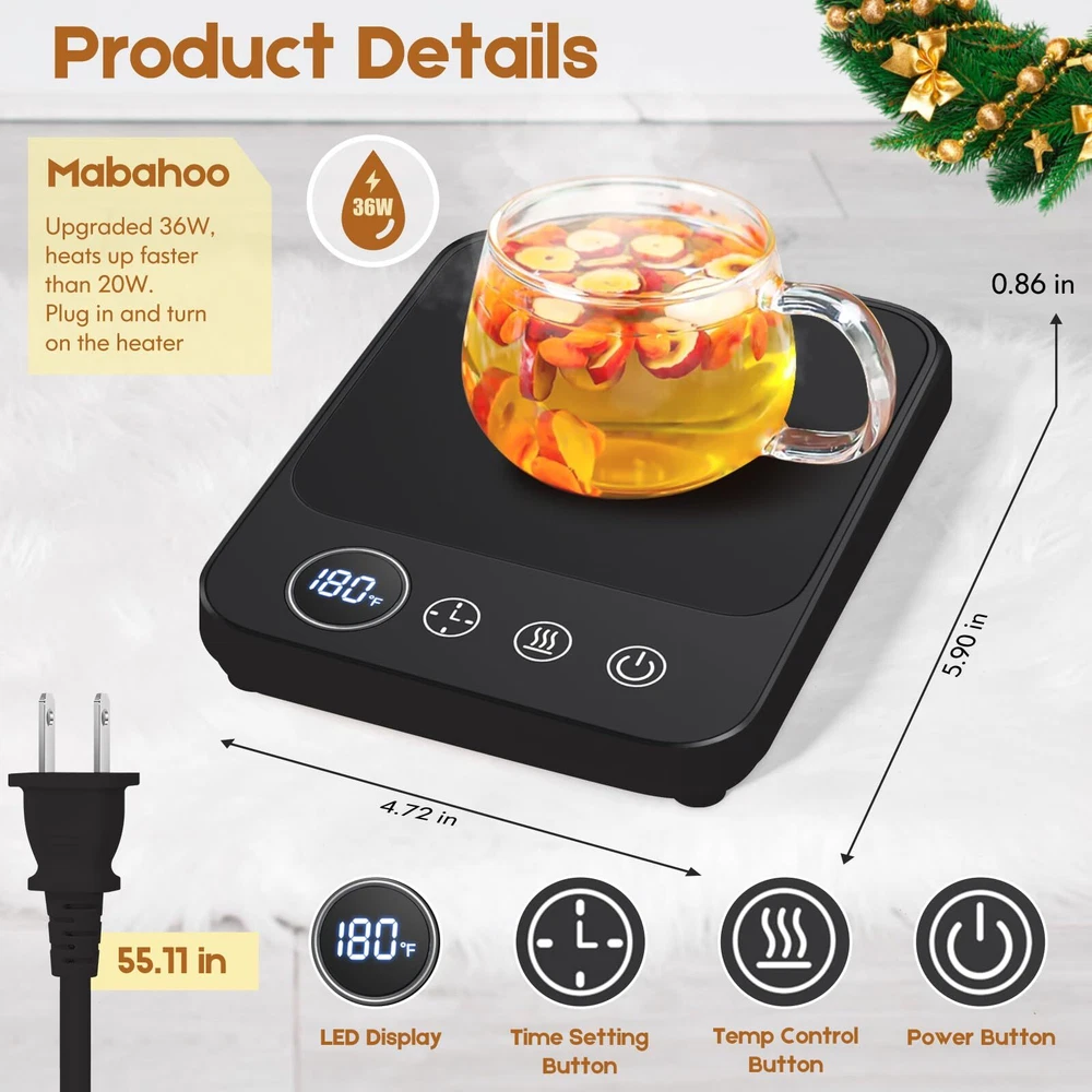 [6 Adjustable Temperature] 36W coffee warmer with upgraded metal heating plat, which rapid heats your drink faster than others in a certain time. Just a simple tap, then you could choose the desired warmth from 130℉-140℉-150℉ -160℉-170℉-180℉. Easy to keep your drinks at ideal temperature while you’re working or relaxing. [12H Time Scheduled] Easy scheduled this mug warmer plate from 1 to 12 hours, save your time and ensure drink taste. Enjoy the convenience and safety with auto shut-off timer cup warmer. With 1.4m (55.2-inch) long power cord provides greater convenience use in office desk, home, kitchen, bedroom, living room, dormitory etc. Let this cup warmer warm your tummy and heart. [Safety & Efficiency Warmer] Coffee mug warmer features an auto shut-off function after 8 hours of continuous use, ensuring maximum safety. And low-power design keeps your coffee or tea warm efficiently, making it an ideal for long work sessions or extended relaxation periods. Besides, the anti-slip bottom provides stable placement on various tabletops to enhance safety. [Compact Size and Multi-Functional] Smart warmer size is 5.9 x 4.7x 0.79 inch. Coffee mug heater features only 0.79 inches thick, weight is just 0.54lb. Lightweight and space-saving design for you carry to anywhere. Very suitable for flat bottom like ceramic, stainless steel, glass cups etc. Perfect for heating coffee, milk, tea or chocolate. This heating plate used as a candle warmer, allowing you to enjoy the delightful scents of your favorite candles in safety situation. [A Warmer Coffee Gift] With its classic design, this coffee warmer for desk combines style and functionality, making it a perfect gift for your loved ones or friends in any occasion— White Elephant gift, Christmas gift, New Year, Valentine's gift or other festivals. It keeps your coffee or tea warm all the time, no coffee enthusiast can resist the desktop coffee cup warmer. Any questions about this warmer plate, please feel free to .