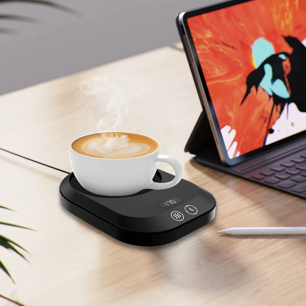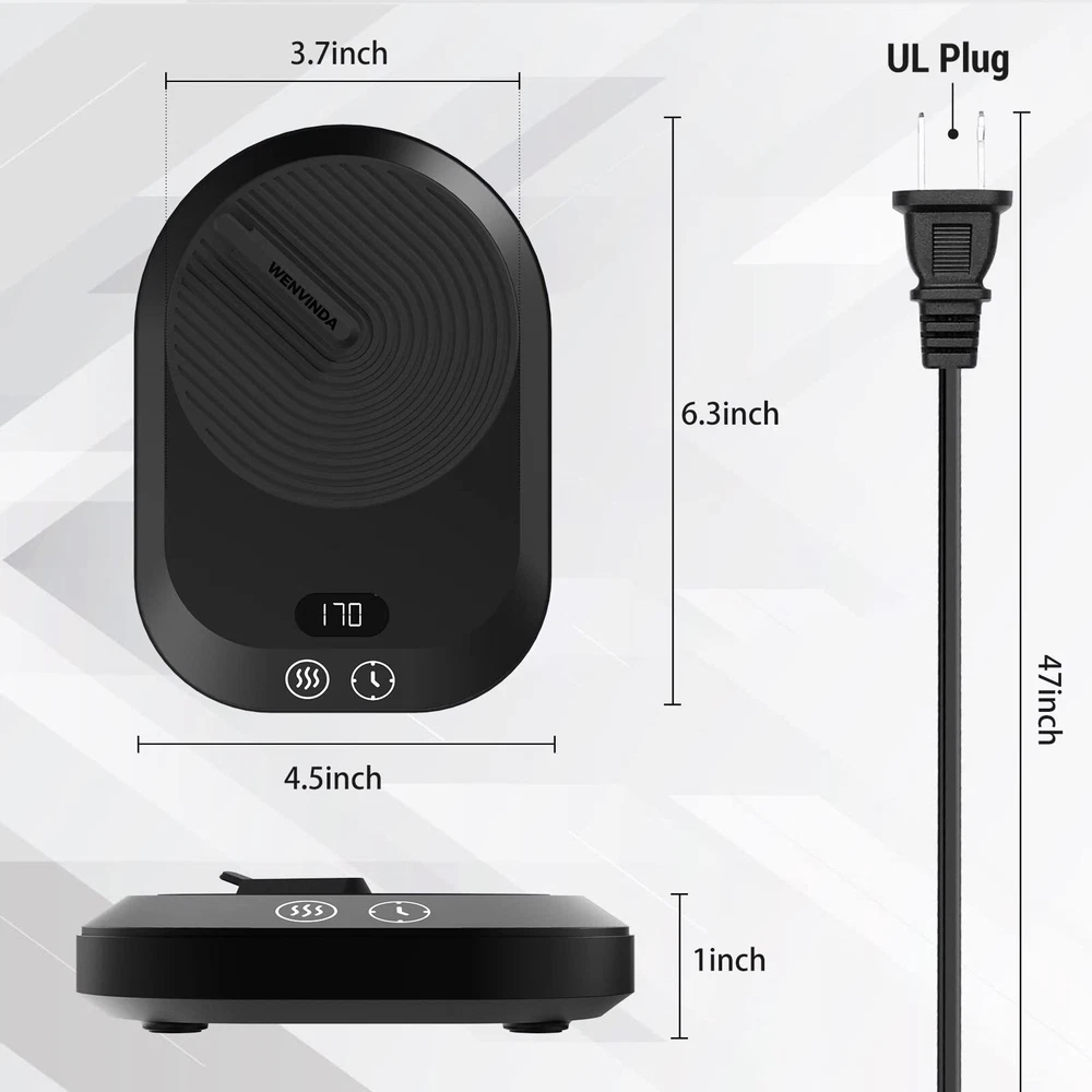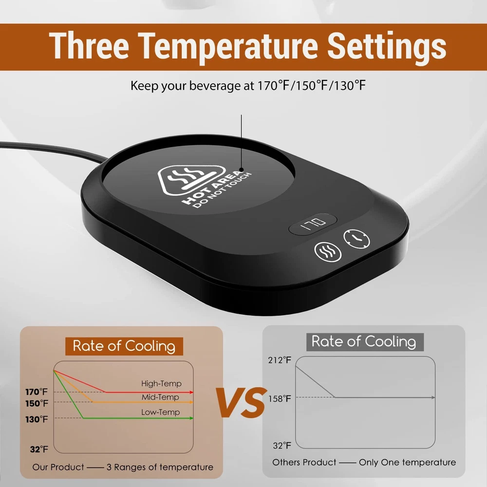 Coffee Cup Warmer with 3-Tem Settings -- The coffee mug warmer for desk keeps the coffee as hot as you want it to be. There are 3 temperature settings: 170℉/150℉/130℉. You can choose the temperature you want by touching the “Power Button”. With the cup warmer, keeping the drinks warm/hot is no problem. 2-12H Timed Auto Shutdown Mug Warmer -- The coffee mug warmer with auto shutdown timer will automatically shut down after 4 hours of continuous operation by default. We set up six options of 2-12h according to different use conditions of users. You can set the automatic shutdown time according to your own needs. More convenient and effectively prevent the safety hazards caused by forgetting to close with the coffee warmer. Safe & Durable -- The surface of the coffee mug warmer is covered with a layer of silicone pad, both beautiful and heat-resistant. The spill-proof design avoids damage and makes cleaning a breeze. The heating plate is 37 inches in diameter and fits most cups. For Most Mugs -- Whether the bottom of the cup is flat or not, our mug warmer for desk can play a good insulation effect. The diameter of the heating plate is 3.7in fitting more cups. For your safety, please do not use heat-labile containers such as paper and plastic cups. Best Gift -- Beautiful appearance design, practical function. The coffee warmer will be the best gift choice to show your care to your families, lover, or friends on Valentine's Day, Thanksgiving, Christmas, New Year, or other special occasions. No coffee lover can resist the coffee cup warmer for desk.