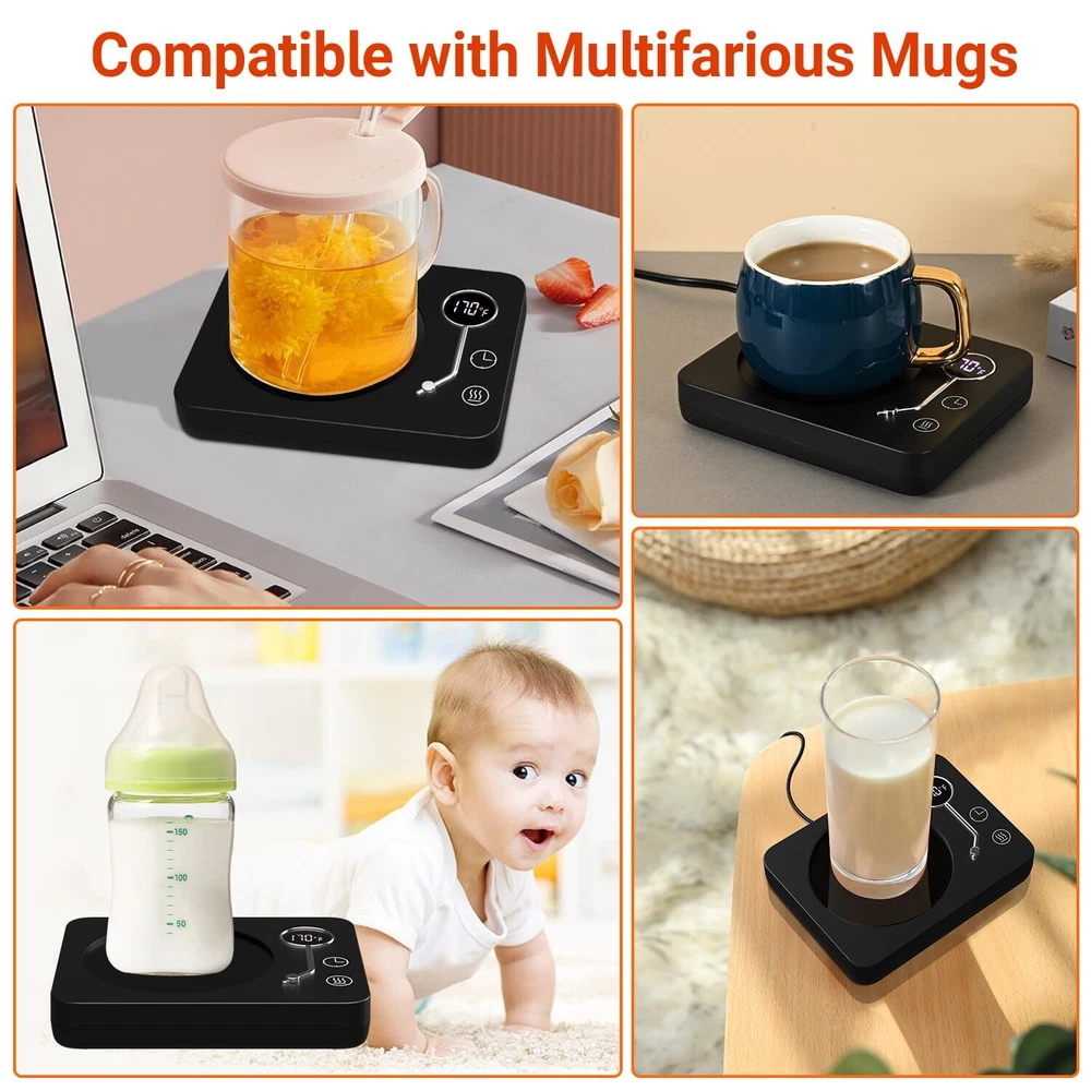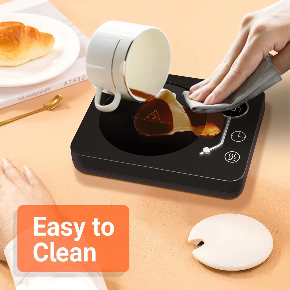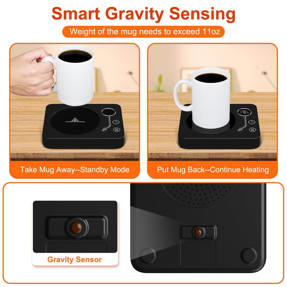 130℉/150℉/170℉ Temperature Settings Coffee Warmer: Provide more heat than other coffee mug warmers, say goodbye to lukewarm coffee! Our mug warmer is designed with 3 temperature settings, you can touch the “Temp Button” to keep or warm up your drink to 130℉(104℉-130℉), 150℉(131℉-150℉) and 170℉(151℉-170℉) . Please Note that the heating temperature is affected by the environment and the thickness of the cup, use mugs with thin-wall and flat-bottom will get the best warming performance 2-12H Timer Settings and 4H Auto Shut Off: In order to prevent the danger caused by forgetting to take down the cup, our mug warmer has timing functions. You can touch the "timing button" , set it to be automatically turned off after 2, 4, 6, 8, 10, 12 hours. 4H auto Shut-off function, if you don't set the timer function, the warmer will automatically shut down after 4 hours by default Portability and Compatibilit: Compact design (4.9*5.7*0.98 in/ 0.6 lb) make you take it with your business trips or travel, and have a sip of hot coffee anytime. The 3.75in heating area is suitable for most of mugs, such as flat ceramic mug, glass cups, stainless steel cups and baby bottles. It is suitable for hot coffee, hot chocolate, tea, milk, other beverages. It can also be used as a candle warmer plate to warm up your scent candles to fill your room with fragrance Microgravity Sensing Switch: There is a microgravity sensor switch at the bottom of the coffee mug warmer. After plug in the power and press the "Temp Button", the coffee warmer will automatically turn on/off when you put /remove the cup. If the cup is not put back within 10 minutes, the coffee mug warmer will automatically shut down. This safety feature helps reduce the danger of forgetting to turn off the heater Digital Display and Touch Button: This coffee mug warmer for desk is designed with LED digital display and touch buttons. You just need to gently touch the “Temp Button” and "timing button" to set the temperature and timing you want. The display can show your temperature selection and timing selection, it is very convenient for you to use it even in a dark environment Safe & Durable: Our warmer has passed CE and FCC certifications and passed 10000 tests to ensure its safety, please use it with confidence. The bottom and sides of the mug warmer are made of heat-resistant material, so don't worry about burning your hands and damaging the table. It has great water resistance, don't worry if you accidentally splashing water on the warmer