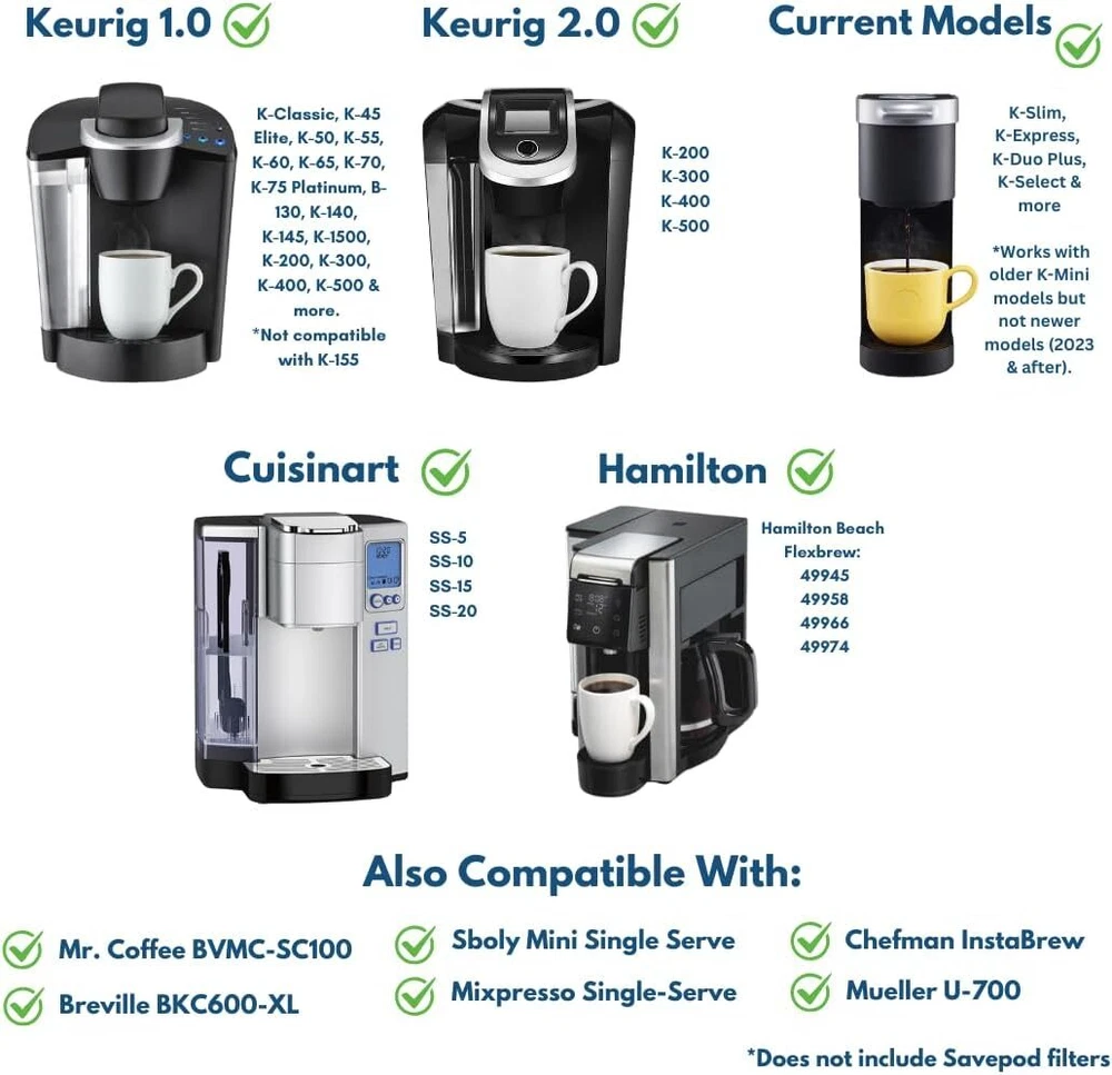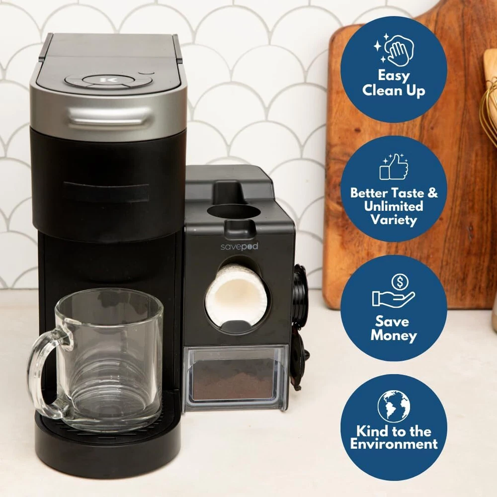 Coffee Pod Maker for Single Serve Machine, Keurig Slate Black Product Details Material: Plastic Brand: Savepod Shape: Basket Number of Pieces: 1 Unit Count: 1.0 Count COFFEE PODS MAKER: Introducing Savepod—the new standard in single-serve brewing. This coffee pod system makes truly Earth-friendly pods in seconds! Our coffee pods are 100% compostable with the only waste being our paper filter and used coffee. 1 Savepod Used = 1 Plastic Pod Saved HOW IT WORKS: Savepod sits beside your single serve coffee maker, with everything you need to make a fresh pod. Fill a pod with any coffee then place inside your single serve brewer. After brewing, simply open the reusable ring to dump out the waste. Savepod is compatible with all K Cup 1.0, 2.0 and K Supreme brewers. QUALITY COFFEE MAKER: Drink quality coffee while eliminating plastic waste with Savepod. Our coffee filters are made from eco-conscious materials that don't compromise taste or quality. Fill them with any fresh coffee of choice and enjoy. EASY CLEAN UP: Say goodbye to cleaning up those messy reusable coffee pods! After brewing simply pop open the reusable ring that's attached to your Savepod and 100% compostable waste falls out. Each reusable ring is made from food-grade materials and is dishwasher safe. DURABLE AND EFFICIENT: Made from durable, BPA-free materials, Savepod is designed to last for years. It'll save you 80% compared to pre-filled single serve coffee pods and each bundle includes one pod maker, two reusable rings (1-hole & 5-hole), 100 coffee filters, plus a custom, quality coffee scoop!