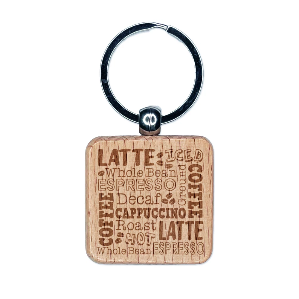 Coffee Words Engraved Wood Square Keychain Tag Charm