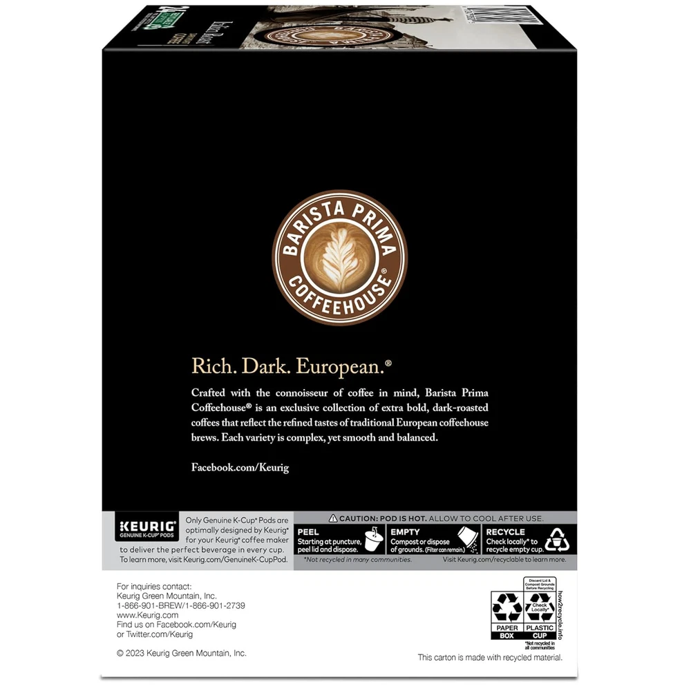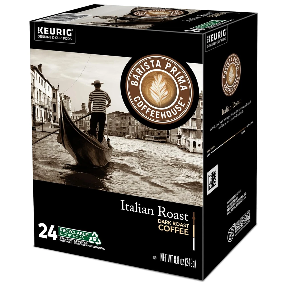 Bold yet ideally balanced, with a subtle hint of smokiness and a sweet Dark roast, caffeinated coffee Certified Orthodox Union Kosher Compatible with Keurig K-Cup pod single-serve coffee makers RECYCLABLE* K-CUP PODS: Simple. Delicious. And Recyclable. Enjoy the same great-tasting coffee you know and love, and when you’re done just peel, empty and recycle. *Check locally, not recycled in all communities. Packaging may vary. This rich, heavy-bodied cup with its ripe fruit and berry notes epitomizes the time-honored Italian tradition of dark-roasted coffeehouse brews. Bold yet ideally balanced, with a subtle hint of smokiness and a sweet, clean finish, Barista Prima Coffeehouse Italian Roast is a hearty and flavorful testament to the art of dark roasting. Its uniquely potent flavor profile has been masterfully crafted to occupy a special niche between the bright, bold taste of our Colombia offering and the intense, smoky-sweet essence of French Roast. A discriminatingly versatile cup; the ideal accompaniment to sunrise or the perfect ending to an unforgettable meal.