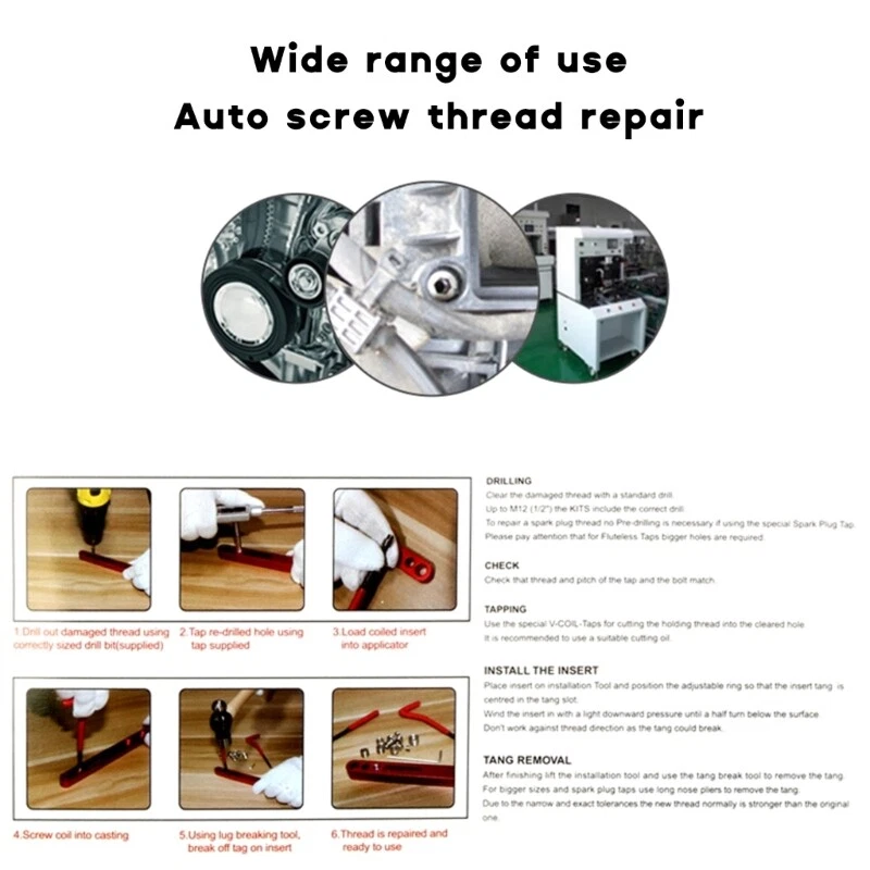Features: This repair includes insert installations, wire thread inserts, twist drill-bits, thread taps, lug-breaking tools. With package-case, convenient to store and carry, you can easy and fast-to collect and take out. Made of premium-quality material, reliable and durable-for a long-time use. Perfect for restoring damaged-threads, suitable for engine repair and other-automotive. Applications for steel, cast iron and aluminum. Can be used in daily-repair, car repair, drilling machine, Specifications: Material:Stainless Steel Size: As Picture Shown Package Includes: Set Thread Repair note: ①.Please allow 1-2cm errors due to manual measurement, make sure that you do not mind before you order. ②.Due to the difference between different monitors, the picture may not reflect the actual color of the item. Thanks for your understandings.
