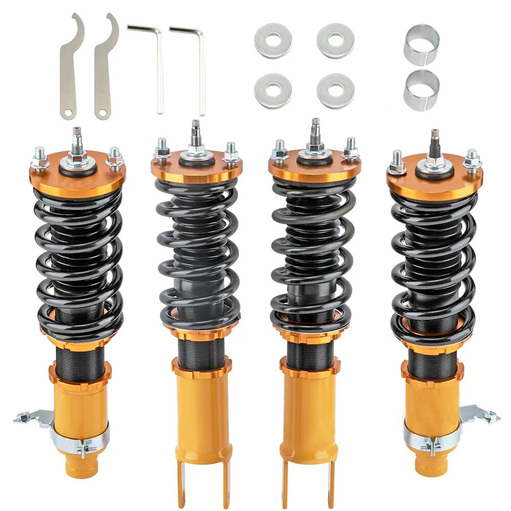 Features - 24 Step to adjust soft / hard adjustment according to your preference - Ride Height Adjustable - Drops From 1 to 3 Inch From Factory Ride Height - 55CrSi high strength durable cold wound steel & heat treated coils - Manufactured from high quality T-6061 billet aluminum with an anodized finish for superior strength and corrosion protection. - Improved Handling and stability without premature tire wear - Improved Vehicle Stability and traction in hard cornering situations - Full threaded absorber tube casing for independent height adjustment - Twin-Tube System for Comfortable Ride on Streets Application For Honda Civic / CRX 1988-1991 EE EF EC For Honda Civic 1992-1995 EJ EG EH fork type For Honda Civic 1996-2000 EK For Acura Integra 1990 -1993 DA DB fork type For Acura Integra 1994-2001 Specifications - Front and Rear top mount: rubber - Damping: 24 levels rebound damping adjustable - Spring rate Front: 8 kg/mm (448 lbs/in) - Spring rate Rear: 5 kg/mm (280 lbs/in) - Spring length Front: 180mm - Spring length Rear: 180mm - Adjustable height: lowering 1-3inch - Coilover overall length Front: 365mm-410mm - Coilover overall length Rear: 435mm-480m - Shock type: Twin tube - Spring Preload: 7-10 mm Package included - Complete 2 Front + 2 Rear coilovers - A pair of wrenches for height adjustment - For some vehicles, you will need sleeves and washers that already included in our package.
