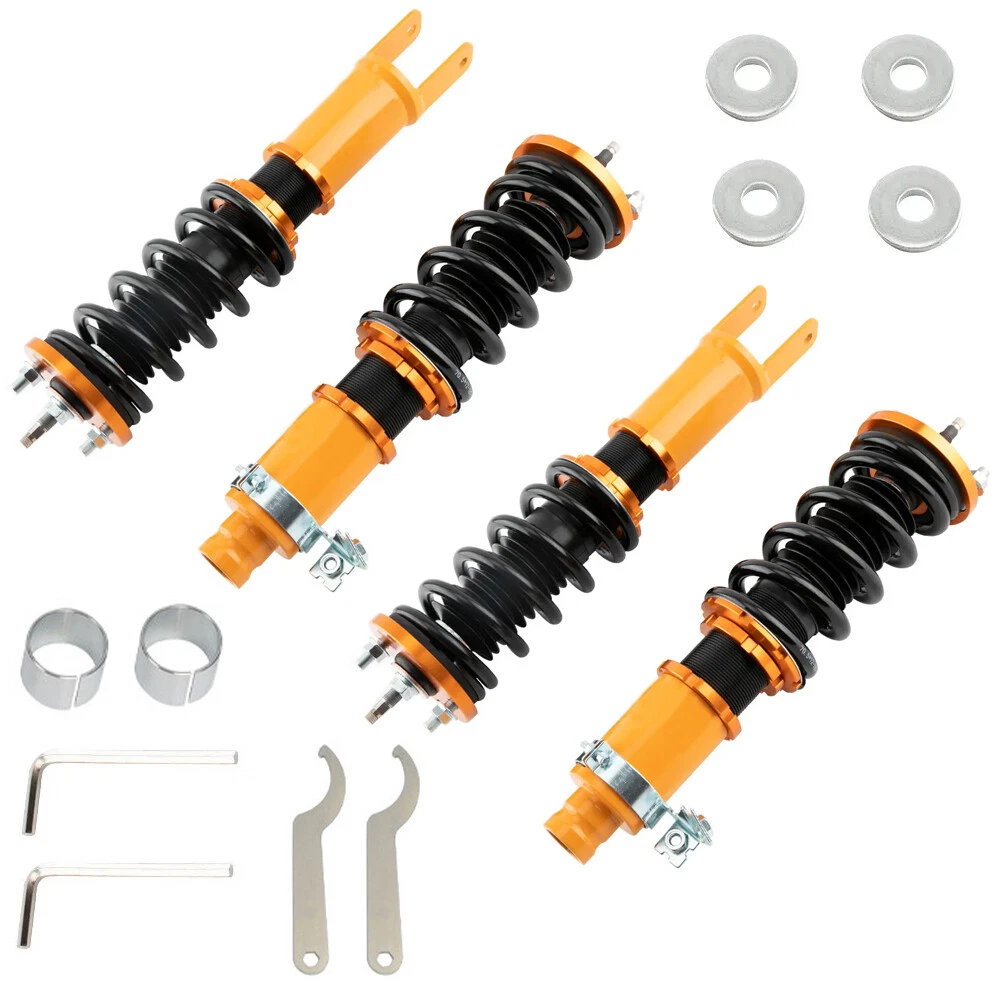 Features - 24 Step to adjust soft / hard adjustment according to your preference - Ride Height Adjustable - Drops From 1 to 3 Inch From Factory Ride Height - 55CrSi high strength durable cold wound steel & heat treated coils - Manufactured from high quality T-6061 billet aluminum with an anodized finish for superior strength and corrosion protection. - Improved Handling and stability without premature tire wear - Improved Vehicle Stability and traction in hard cornering situations - Full threaded absorber tube casing for independent height adjustment - Twin-Tube System for Comfortable Ride on Streets Application For Honda Civic / CRX 1988-1991 EE EF EC For Honda Civic 1992-1995 EJ EG EH fork type For Honda Civic 1996-2000 EK For Acura Integra 1990 -1993 DA DB fork type For Acura Integra 1994-2001 Specifications - Front and Rear top mount: rubber - Damping: 24 levels rebound damping adjustable - Spring rate Front: 8 kg/mm (448 lbs/in) - Spring rate Rear: 5 kg/mm (280 lbs/in) - Spring length Front: 180mm - Spring length Rear: 180mm - Adjustable height: lowering 1-3inch - Coilover overall length Front: 365mm-410mm - Coilover overall length Rear: 435mm-480m - Shock type: Twin tube - Spring Preload: 7-10 mm Package included - Complete 2 Front + 2 Rear coilovers - A pair of wrenches for height adjustment - For some vehicles, you will need sleeves and washers that already included in our package.
