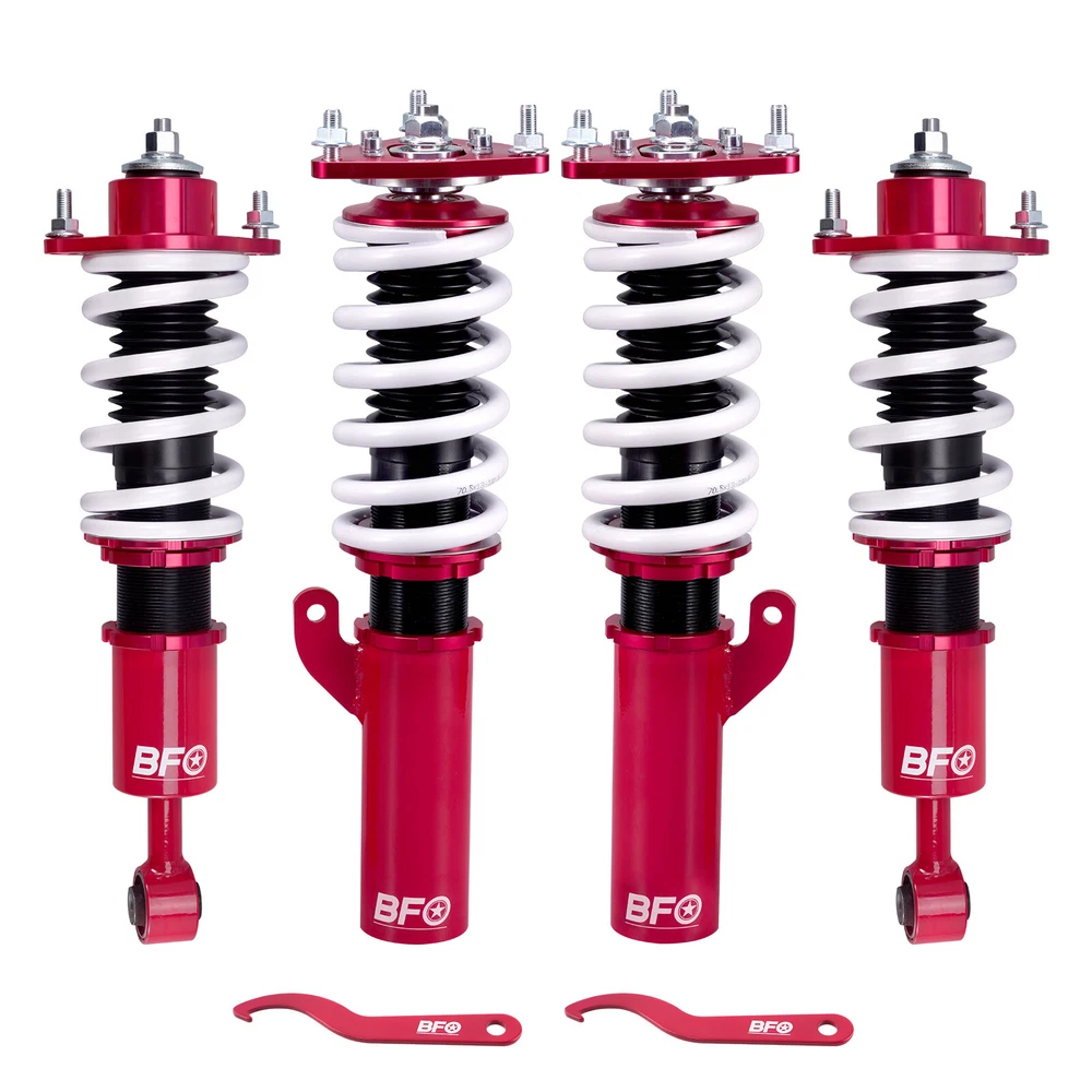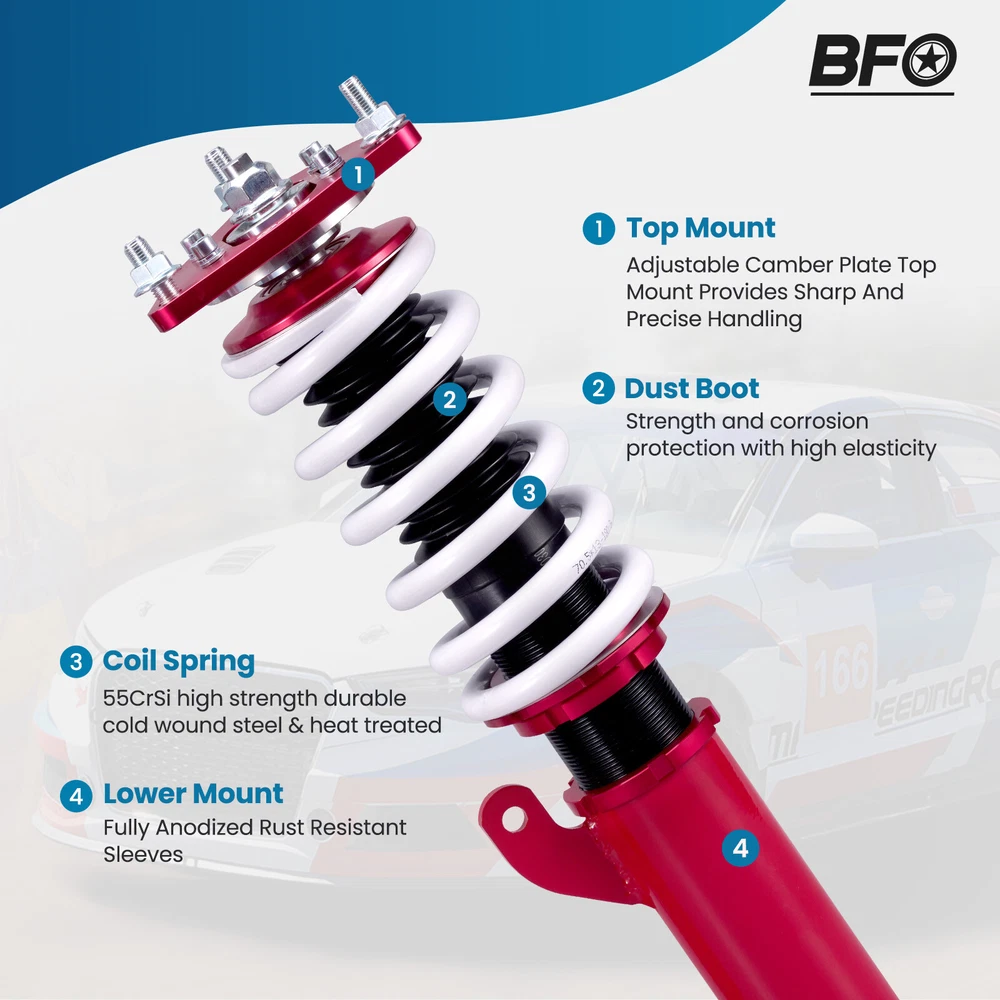 ZJPSS Coilovers Suspension Adj Height Shocks Absorbers Kit For Mitsubishi Lancer 08-16 Features 1. Lowered height adjustment from 25-75mm (depends on vehicle models)which allows a lower center of gravity and also add a more aggressive stance 2. Adjustable pre-load spring tension to reduce the shaking motion to a certain extent 3. Adjustable Camber Plate and Pillow ball top mount for sharpening steering response.( for some models) 4. CNC machined Aluminum top mounts and lockers-- - excellent strength, and save weight 5. Heavy Duty Steel Lower Mounts--- Highly Durable & Reliable 6. High tensile spring--- 600,000 times continuously test to assure its high tensile strength. 7. All inserts come with fitted long rubber boots--- To protect the damper better and be durable. 8. Twin-Tube structure ---provides excellent handling & control characteristics for most driving conditions 9. Anti-Corrosion Finish - Anodized Aluminum And Powder Coated Carbon Steel Parts Application For Mitsubishi Lancer(CX/CY) 2008-2016, except Lancer Evolution For Mitsubishi Outlancer Sport(GA) 2011-2020 Specification - Front top mount: Pillow ball - Rear top mount: Standard rubber - Damping adjustable: Not available - Height adjustable: Yes, lowering 25-75mm depending on the vehicle models - Spring Rate Front: 9kg/mm (504 lbs/in) - Spring Rate Rear: 6 kg/mm (336 in/lbs) - Front spring inner diameter: 70.5 mm - Rear spring inner diameter: 70.5 mm - Spring length Front: 190 mm - Spring length Rear: 160 mm - Spring Preload advised: 7-10 mm - Color: Red - Package size: 63*51*21 cm - Weight: 23900 g Package included 2x Front coil-overs 2x Rear coil-overs 1x Allen wrench 2x C spanners ★ 30-day Money Back & 12-Month Replacement Guarantee. Please feel free to contact us if there is any question. Height Adjustable Lowering Kit; Independent Ride Height And Spring Tension Settings; High Rigidity 55CrSi Steel Cold-bent Springs; Anodized Shock Body With Anti-Corrosion Coating; Top Camber Plate with Pillow Ball Mount Provides More Precise Feel From Suspension And Steering; Full 1 Year Limited Warranty From Date Of Purchase. Other items you might also like BFO Adjustable Coilovers Lowering Suspension Kit for Mitsubishi Lancer 08-16 Coilovers Suspension Shocks Struts Kit for Mitsubishi Lancer (CX/CY) 2008-2016 Shipping Terms of Sales Payment Contact us All orders will be shipped within 1 business day after payment has been processed. For orders placed before 5:30 AM PST on business days, most items will be shipped out on the same day. All orders will be shipped with a tracking number via USPS, UPS, or FedEx Express and delivered within 2-6 business days We do not ship to P.O. Boxes, APO/FPO addresses, or Military Mail Boxes. Please ensure your address is confirmed by PayPal before checkout, as we only ship to confirmed addresses. 30-day free return and money back guarantee If you are not satisfied with your purchase, you can return the item with its original packaging to us for a full refund with no restocking fee. Please note that the return cost should be paid by the seller. One Year Unlimited Mileage Quality Guarantee If you receive incorrect items, items that are damaged during transportation, or defective items, we will accept returns and cover the return freight. Please note that the return cost should be prepaid by the buyer. After inspecting the faulty item, we will issue a refund of the return cost to the buyer. We offer a full refund or replacement for all faulty items, which includes the cost of original shipping. Please contact us before initiating a return. Our representatives will provide you with detailed instructions on how to proceed. Our guarantee covers only the cost of the item. We are not responsible for installation or other fees, such as labor, towing, additional repairs, or related expenses. We only accept payment through Paypal for all orders, which should be made through eBay. Paypal offers various payment methods, including credit card, direct debit, VISA, and others. For more information, please visit Paypal. Our customer service center is open 24 hours a day, seven days a week. If you have any questions, please don't hesitate to contact us. We are dedicated to providing excellent customer service and will do everything we can to ensure your satisfaction.