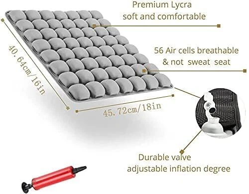 ERGONOMIC DESIGN: Compared to foam support cushions, 's Inflatable Air Seat Cushions is durable and adjustable. It's easy to reach your desired inflation level, 70%, 80% or even fully pumped, it's your comfort and your choice. With hassle free MADE TO LAST: Now for the science part, our high resilience chairs seat pad is covered with comfortable Lycra fabric that is hard wearing and easily washable. The silica grip keeps your seat cushion where you want it to be. To top things off the air pockets are made from eco-friendly TPU materials VERSATILE: Support up to 275 lbs with this chairs seat cushion wherever you need it. Got a long journey ahead? We got you covered! Deadline at the office? No problem! Working on that thesis? Take a seat on this! Maximize your productivity and comfort FRESH AND DRY: Our design maximizes air circulation, when cell is compressed the air flows to other cells around it. Therefore reducing heat transfer and that uncomfortable office chair feeling, all whilst supporting your posture; preventing sede LONG LASTING COMFORT: Specially designed to provide extra support for your hip and back with 56 plump 3D air cells covered with breathable Lycra fabric. This air inflatable seat cushion provides excellent lumbar support which can help to disperse pressure from sitting up to 30% which is proven to reduce aches and pains
