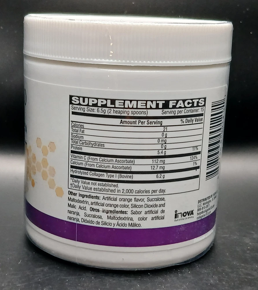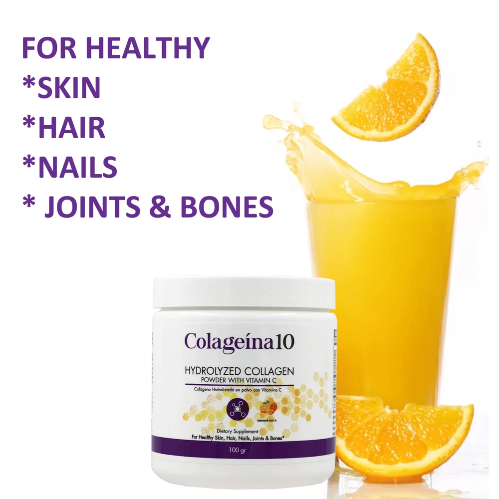 Colageina 10 Hydrolyzed Collagen Powder Supplement. Made with Vitamin C. 3.5 oz Colageina 10 Hydrolyzed Collagen Powder helps maintain the health, strength and beauty of hair, eyelashes and nails. Use it as a supplement to your diet, it is the best way to ensure a healthy and firm body, as it contributes to muscle recovery and joint lubrication. Features Reduces the signs of aging and improves the appearance of the skin Strengthens hair, nails and eyelashes Reconstructs and repairs damaged tissue Reduces pain in the joints Delicious Orange Flavour Description Colageina 10 revitalizes your body from the inside out, allowing collagen to be absorbed more easily. Promotes elasticity and hydration of the skin, giving it a more youthful appearance. Smoothes the skin and minimizes fine lines and wrinkles, reducing the signs of aging. Colageina 10 helps maintain the health, strength and beauty of hair, eyelashes and nails. Use it as a supplement to your diet, it is the best way to ensure a healthy and firm body, as it contributes to muscle recovery and joint lubrication. The Colageina 10 formula includes nutrients such as keratin and vitamin C, which, by combining their properties with those of Hydrolyzed Collagen, increase the growth of hair, eyelashes, and nails. Our product is excellent in assisting you in revitalizing and improving the overall health of the body. We created Colageina thinking to enhance your natural beauty! Thanks for visiting US.