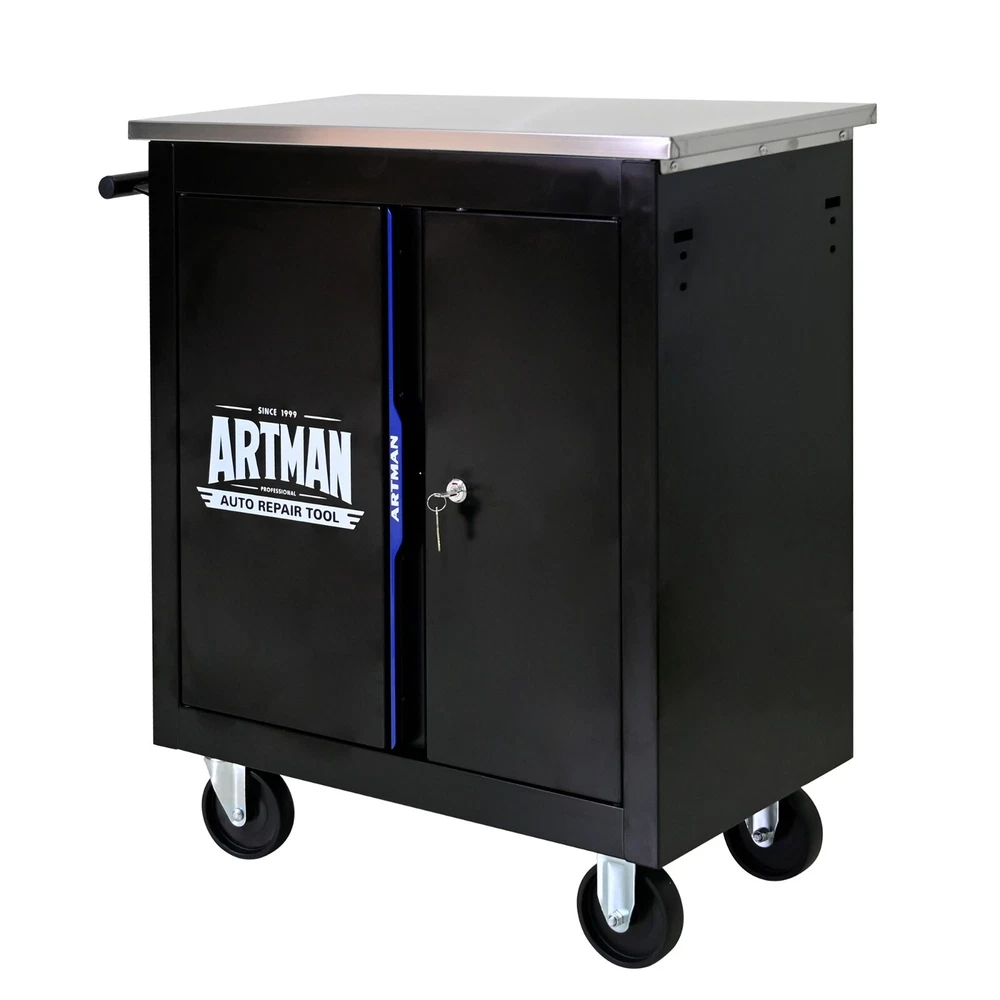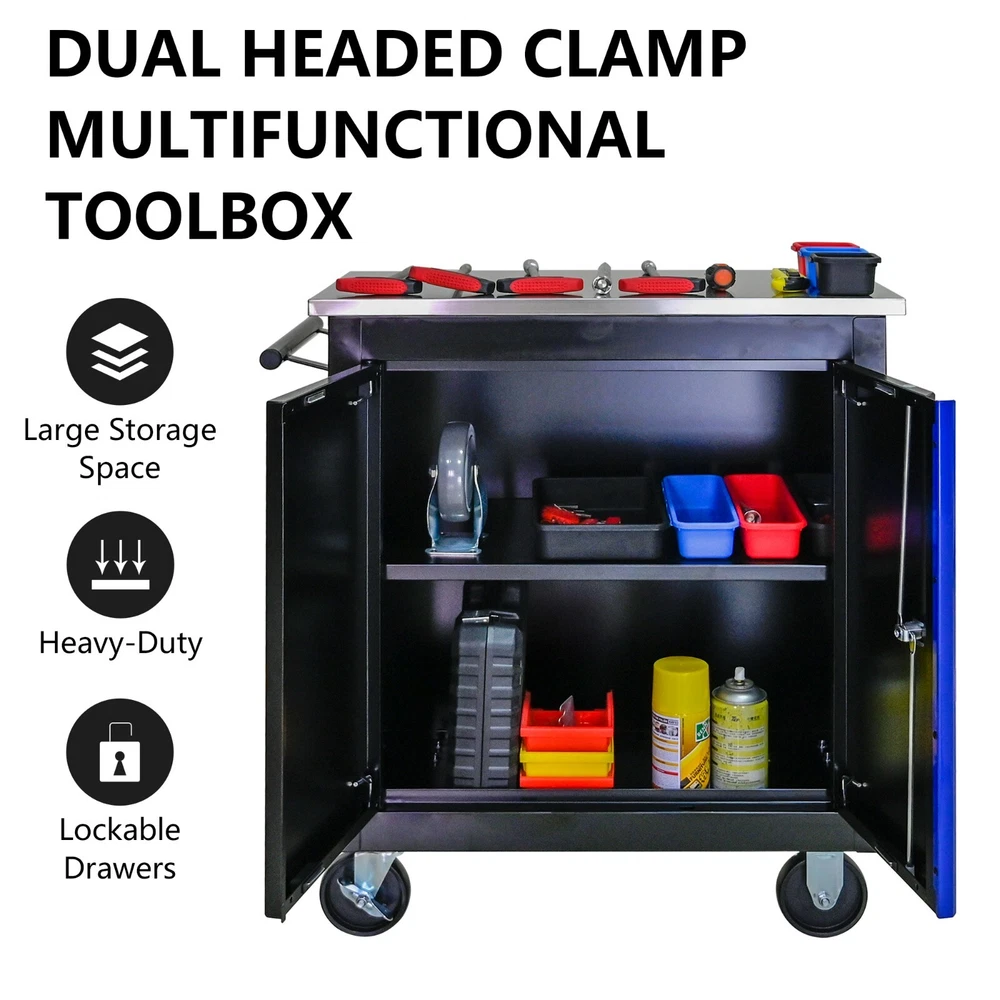 Features and Details: This assembly trolley has 4 steering wheels, 2 of which with parking brakes, so you can move the trolley freely in the garage, but also stop in one place. The storage surface provides additional space for storing and arranging tools you often need. The robust and powder-coated steel construction is used for high wear resistance. This is a set of cabinets, can use a round hook at the bottom of the table to connect another tool car, thus forming a combination. Specification: Color:Black+Blue Material:Cold Rolled Steel Surface Finish:Powder Coating Casters:4" Casters (2PCS with brake and 2PCS without brake) Product Size (with wheels and countertops):25.91*13.58*26.46INCH Package Size:27.36*15.16*28.94INCH Product Size (with countertops):25.91*13.58*25.98INCH Net Weight:39.24LBS Gross Weight:46.08LBS