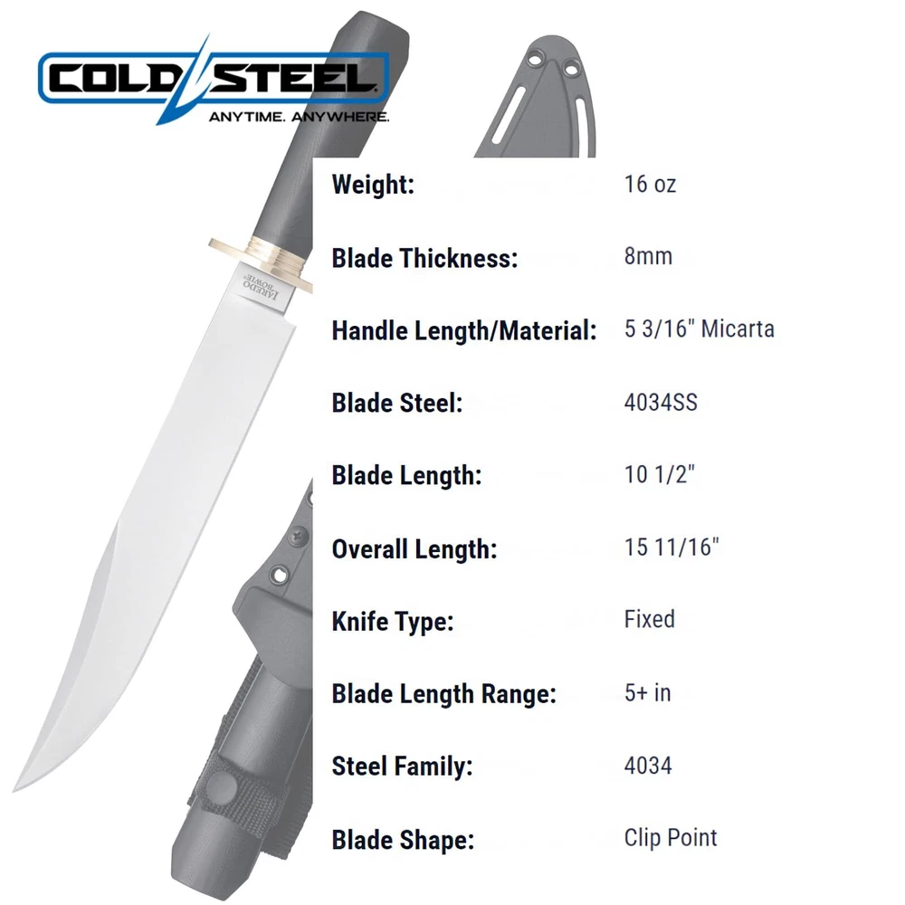 Cold Steel Laredo Fixed Knife 10.5" 4034 Steel Blade Black Line Micarta Handle New Laredo Bowie 15.63" (39.7cm) overall. 10.5" (26.67cm) satin finish 4034 stainless bowie blade. Black G10 handle. Stainless guard. Black Secure-Ex belt sheath. Boxed. Features Made out of A-2 High Carbon Steel Precision ground, heat-treated and Mar Tempered Strength, toughness, and edge retention Rivals our famous Japanese swords Durable and long lasting Details Product Dimensions: 16.0 x 4.0 x 1.0 inches Item Weight: 1.74 pounds Shipping Weight: 1.74 pounds Manufacturer: Cold Steel Item color: Black Item model number: 39LME Item MPN: 39LME Item part number: 39LME Fast and Free Shipping You're already purchasing the item. Why pay additional for shipping, especially slow shipping? We get your order shipped out within 1-business day and delivered to your doorstep as quickly as possible. Competitive Pricing With our dynamic pricing model, our prices are always competitive. Our prices are some of the lowest that you will find on the internet. Rest assured that you're getting a good deal when purchasing with us. 30-day Money Back Guarantee We are committed to making sure that you leave this transaction satisfied. If you're unhappy with the product for any reason, you may return it back for your money-back or a replacement within 30 days. No questions asked!