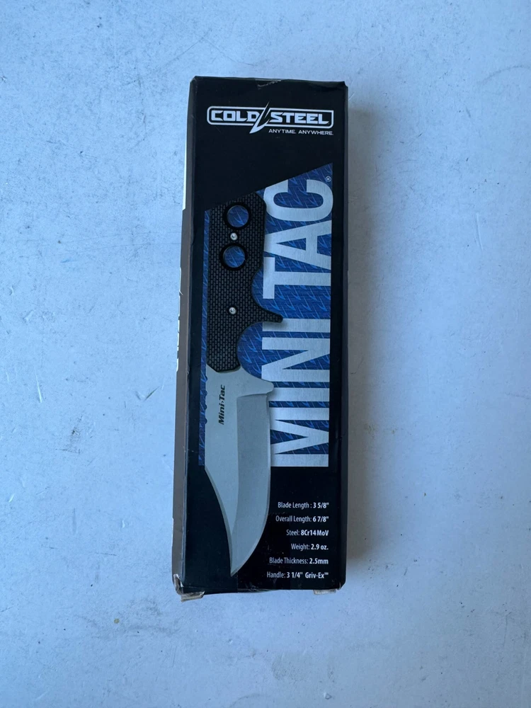 Cold Steel Mini Tac Bowie Hunting Knife Fixed Plain Blade 8Cr14MoV with Sheath Description Cold Steel Mini Tac Bowie Hunting Knife Fixed Plain Blade 8Cr14MoV with Sheath. Product Detail • Brand : Cold Steel • Blade Color : Silver • Type : Hunting Knife Please message me if you have any questions.