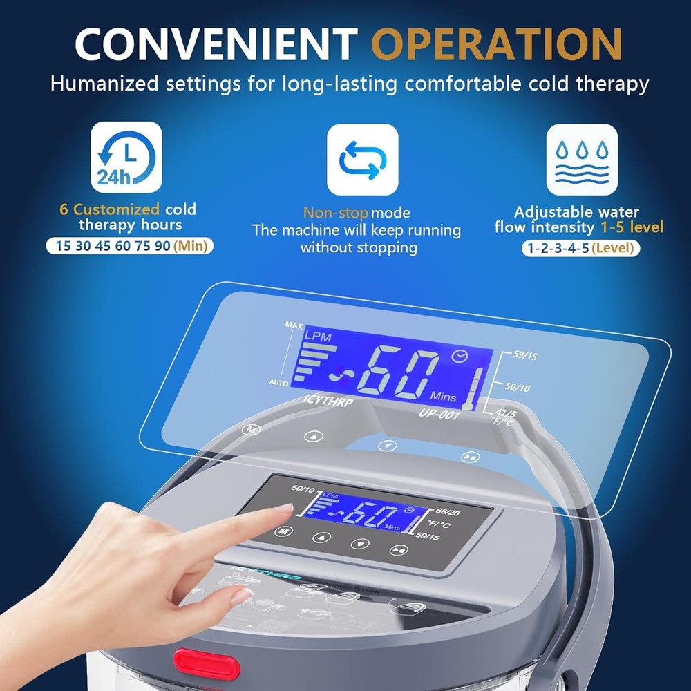 Cold Therapy Machine with Programmable Timer, Ice-Machine-for-Knee-After-Surgery, Knee Replacement Recovery Equipment, Cryotherapy Pain Relief w/Compression Pad for Shoulder, Ankle, Hip Item Description About this item ICE THERAPY RELIEF PAIN: Do you have pain after knee or shoulder surgery? Say goodbye to pain and swelling. ICYTHRP ice machine for knee after surgery to relieve localised pain and swelling after surgery or injury by providing a soothing, constant circulation of cold water. Don't let pain hold you back any longer. CONVENIENT COLD THERAPY: The ICYTHRP Knee Ice Therapy Machine is easy to operate, easy to use, monitors the water temperature, has a no-stop mode and 6 run time modes (15-30-45-60-75-90 minutes), so you can enjoy personalized cold therapy at home and say goodbye to pain. LONG-LASRING COLD THERAPY: The knee replacement recovery equipment with double insulation transparent barrel wall, can clearly see the remaining ice water level at the same time to provide 9 hours of ice therapy, do not need to frequently replace the ice. Enjoy uninterrupted ice therapy and focus on recovery. (Use the included 3 water-filled ice box for extended cold therapy times) COMFORTABLE AND LEAK-PROOF: Experience ultimate comfort and leak-proof protection with our premium ICYTHRP compression cold therapy pads. Designed for knees, shoulders, ankles, feet, hips and legs, ICYTHRP cold therapy pads, tubing and connectors are made of durable composite materials and are leak-proof for targeted pain relief. QUIET RUNNING: High-quality brushless DC motors designed specifically for ice therapy systems are ≤28 dB louder, ensuring a quiet, distraction-free experience even during rest or nighttime use, focusing on effective pain management and rehabilitation. WORRY-FREE AFTER-SALE: At ICYTHRP, Your satisfaction is our greatest aim! That's why we offer a life-time repair on our hosts and professional one-on-one customer service! Your peace of mind is our top priority, and we will provide prompt assistance and replacement if needed. › See more product details *Customized Cold Therapy Time With six run time modes (15-30-45-60-75-90 Min) Say goodbye to pain with personalized cryotherapy at home! *Non-Stop Mode When the running time is adjusted to "00" for non-stop mode, the cold therapy machine will keep running without stopping. *Adjustable Water Flow Intensity Customized water flow intensity (1-5 level) Enjoy the ultimate cold therapy experience with different water flow intensities. Tip: The higher the water flow intensity, the lower the water flow temperature and the louder the operation noise. *ICYTHRP ice therapy system ensures consistent, prolonged cold therapy unlike ice packs that warm quickly. Its flexible pad offers precise targeting. Say goodbye to messy melting ice; embrace efficient, tailored relief. *The machine comes with a uniquely shaped and flexible therapy pad that contours to various body parts — ankle, knee, leg, hip, elbow, shoulder, and arm — ensuring targeted relief wherever you need it. *No, the Ice Therapy Machine is designed to be quiet during operation, allowing for a peaceful and therapeutic experience. Tip: As the intensity of the water flow is set higher, the sound of operation will also increase *ICYTHRP cold machine has a timer mode, from 15-30-45-60-75-90 minutes, 6 timer time for you to choose; just press the "M' button twice, you can choose the timer, and then you can carry out the cold therapy. *Absolutely! The pad is constructed from a high-quality composite material with reinforced seams to ensure long-term use without any leaks. Say goodbye to pain with personalized cryotherapy at home! When the running time is adjusted to "00" for non-stop mode, the cold therapy machine will keep running without stopping. Enjoy the ultimate cold therapy experience with different water flow intensities. Tip: The higher the water flow intensity, the lower the water flow temperature and the louder the operation noise. Payment We accept payment only through PAYPAL Shipping We ship products worldwide through standard express courier service, it will reach within 7 to 10 days to abroad buyers, we ship the product after recieved clear payment and give full information about shipment to the buyer Return We accept product return within 7 to 21 days from delivery date but product should be in original position and not in damaged condition,the return shipping charges will be buyer responsibility