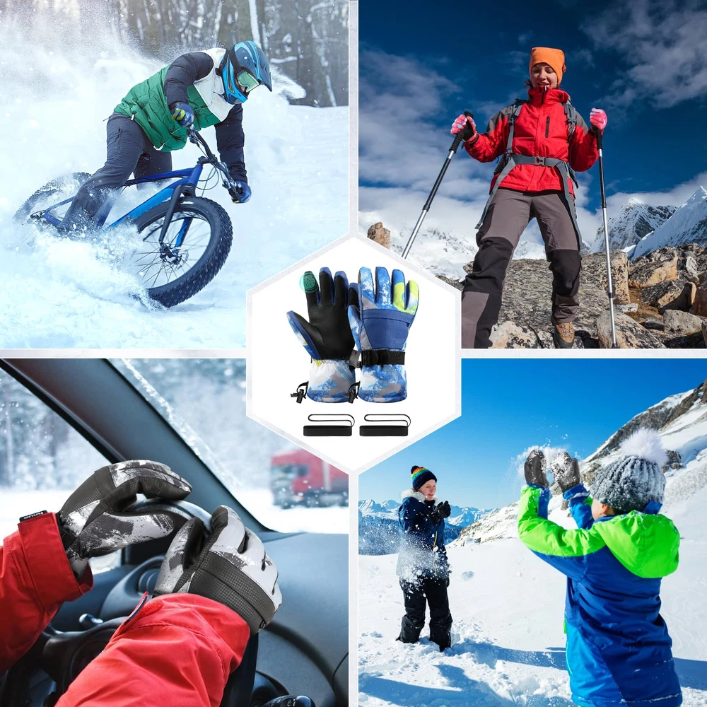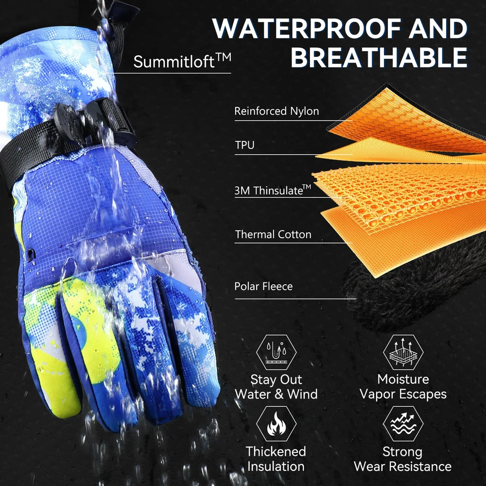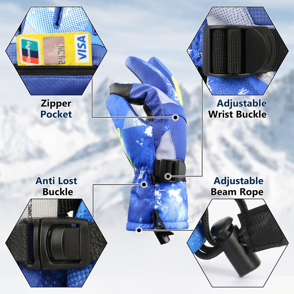 【3M Thinsulate Insulation】The Ski gloves are insulated with warm and lightweight thinsulate 3M,which is thick enough to keep hands warmth in cold chilly weather in skiing, snowboarding, winter riding, hiking and other snowsports. 【Touchscreen Fingertips】Our winter ski gloves are designed with touchscreen-compatible materials on the fingertips, allowing you to use your smartphone or other devices without removing the snow gloves. You do not need to take off the ski gloves when skiing or doing some other winter sports. 【Waterproof and Windproof 】The Snow Gloves composite three-layers softshell prevents cold wind and snows outside in riding and skiing. The insert waterproof TPU membrane provides entirely guards to keep hands dry in long time snowsports at outdoors. It's better to air dry for a while if sweats a lot. 【Zipper Pocket and Custom Fit】The pocket is easy to carry keys, ID cards or little cash as well as smaller size gloves warmers. The adjustable buckle wrist strap and the drawstring closure is effectively prevents against cold air outside.Flexible Design Children Gloves,ergonomic pre-Curved fit and removable wrist leash for flexible stretching of your hands. 【WARMER and DURABLE MATERIAL】: Snow gloves are made of double thicken locking thermal fleece, waterproof TPU and Splashproof outer materia, which are moisture-wicking, superior breathablity, warmth and comfortable. Resist the temperate under -22°F TO -4°F.