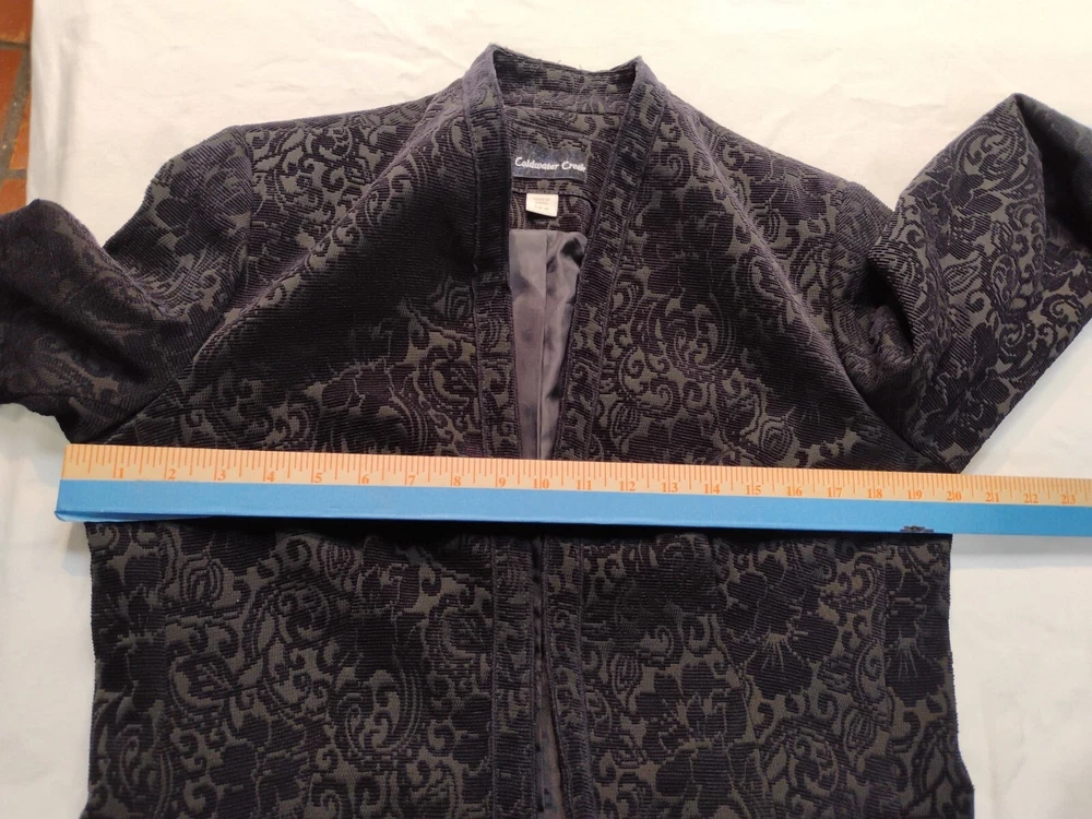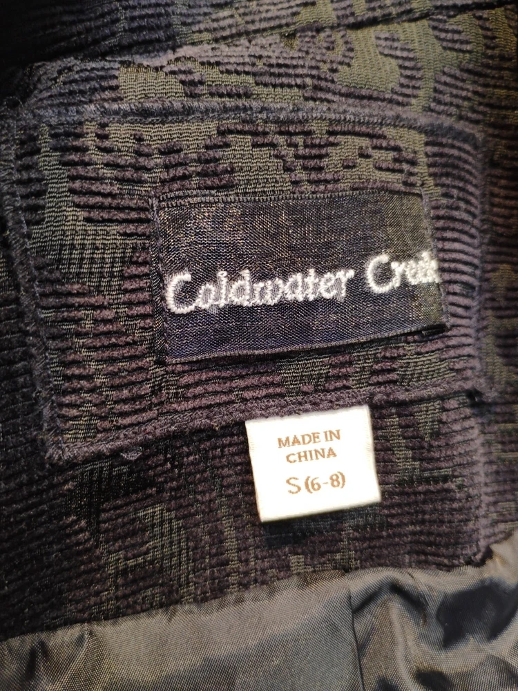 Pattern:FloralOccasion:Business, Casual, TravelJacket/Coat Length:RegularStyle:BlazerFeatures:LinedSize:SType:BlazerSize Type:RegularLining Material:100% PolyesterSeller Notes:“Blazer is in a great condition. Pre-owned item.”Department:WomenSleeve Length:Long SleeveNumber of Pieces:1 PieceColor:BlueBrand:Coldwater CreekFabric Type:CorduroyMaterial:PolyesterSeason:Fall, Winter