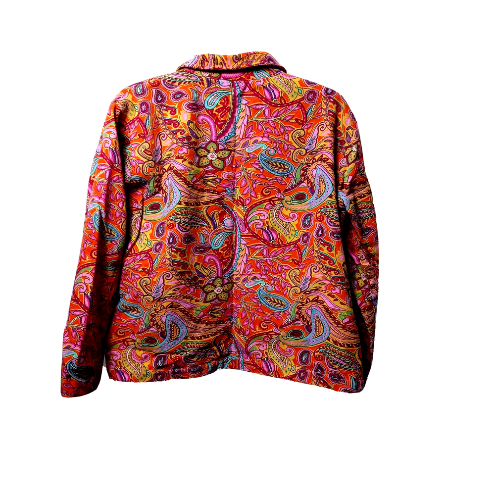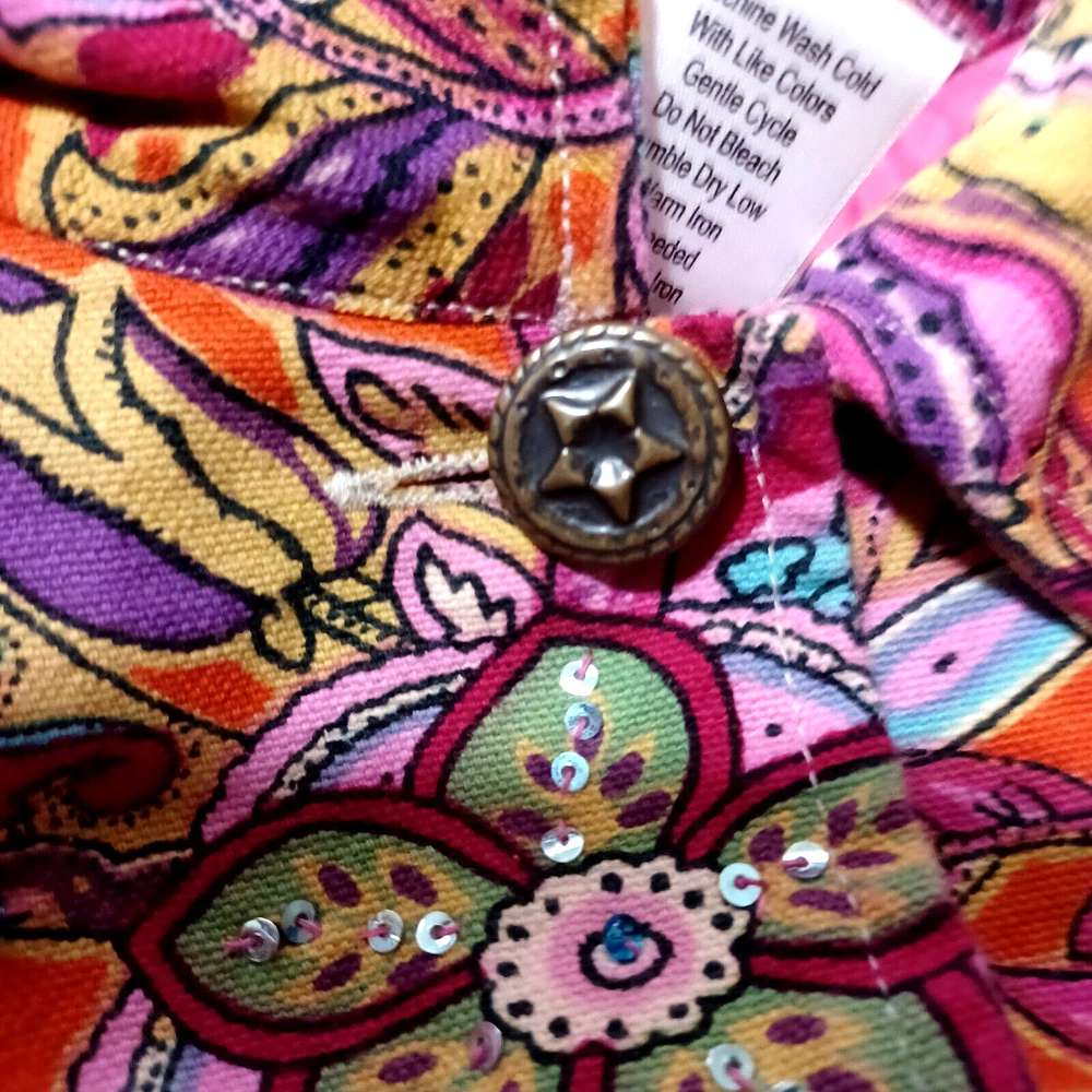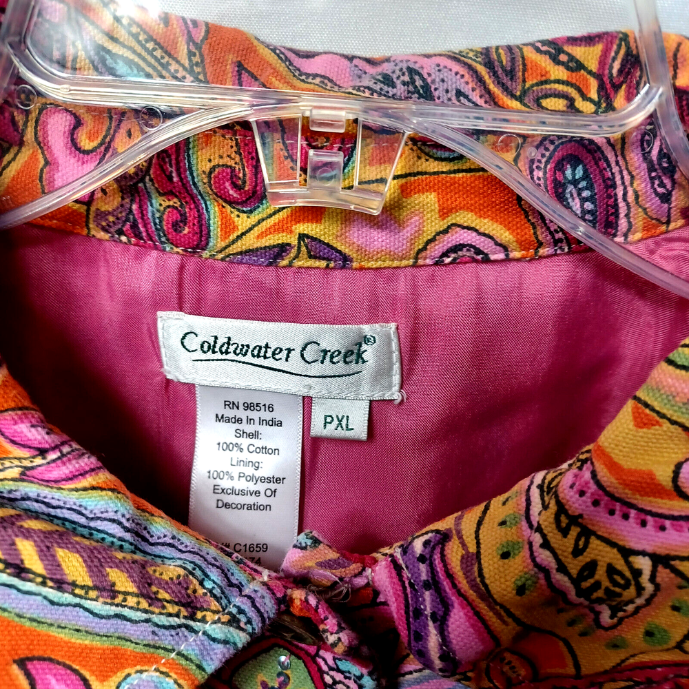This Coldwater Creek jacket is a stunning addition to any wardrobe. The bright, colorful design is perfect for any occasion, and the lightweight material ensures comfort all day long. With a size of PXL, this jacket is ideal for petite women who want to stand out from the crowd. The jacket is made with cotton as the outer shell material and lined with polyester. It's a basic jacket style that is perfect for those who prefer a more casual look. The jacket features a Coldwater Creek brand, ensuring quality and style. Don't miss out on this beautifully designed jacket that is sure to turn heads wherever you go. Please check these measurements with something you know fits: Pit to pit 24 inches length shoulder to bottom 23 inches sleeve 20 1/2 inches