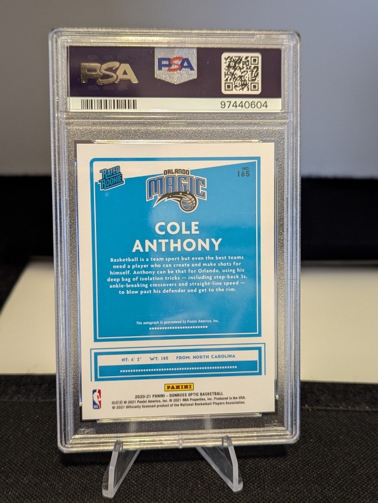This Cole Anthony RC sports trading card is a must-have for any basketball fan. Featuring a 2020 Donruss Optic design, this card is a rated rookie autograph with a certification number of 97440604 and a grade of 275020. The card is manufactured by Donruss and has a parallel/variety of Optic. The card number is 165 and it is from the 2020 season. A professional grader of 275010 has evaluated this card. Its features include a rookie designation, making it a valuable addition to any sports trading card collection.
