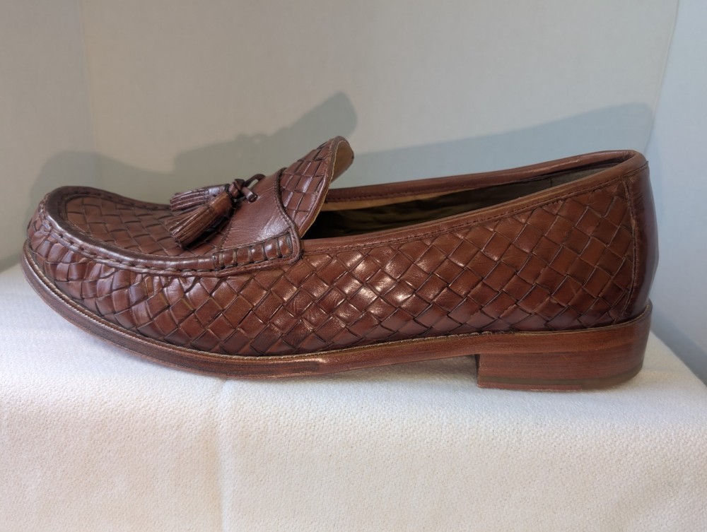 EXCELLENT CONDITION, WORN ONLY 1 X. The Cole Haan Basket weave Tassel Loafers in size 12 are stylish and comfortable dress shoes perfect for various occasions. Made with high-quality leather and featuring a slip-on closure, these loafers have a classic round toe shape with tasseled accents for a touch of sophistication. With a cushioned and breathable insole, these loafers are designed for all-day wear and can be worn in all seasons. The solid brown color and leather lining make them versatile for both casual and formal outfits, making them a great addition to any man's shoe collection.