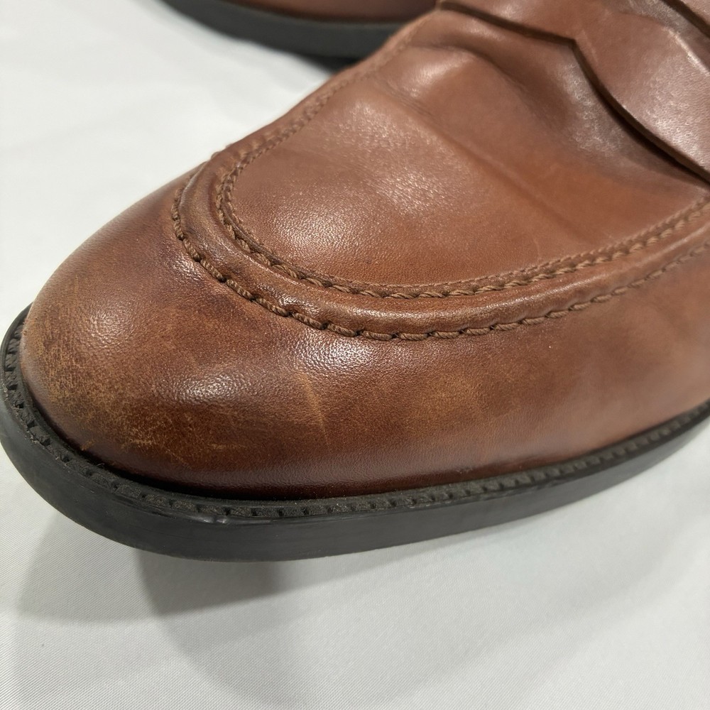 The Cole Haan Classic Hawthorne Brown Penny Loafers in size 11 for men are a stylish and versatile choice for dressy occasions. Made from 100% leather, these solid brown loafers feature a cushioned insole for added comfort. The timeless penny loafer style is perfect for the seasons of summer, fall, and spring, making them a classic addition to any man's wardrobe.