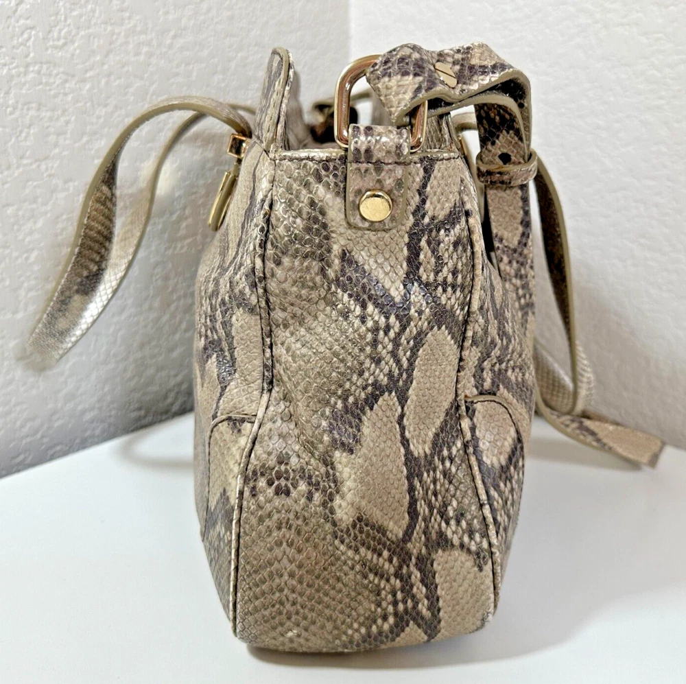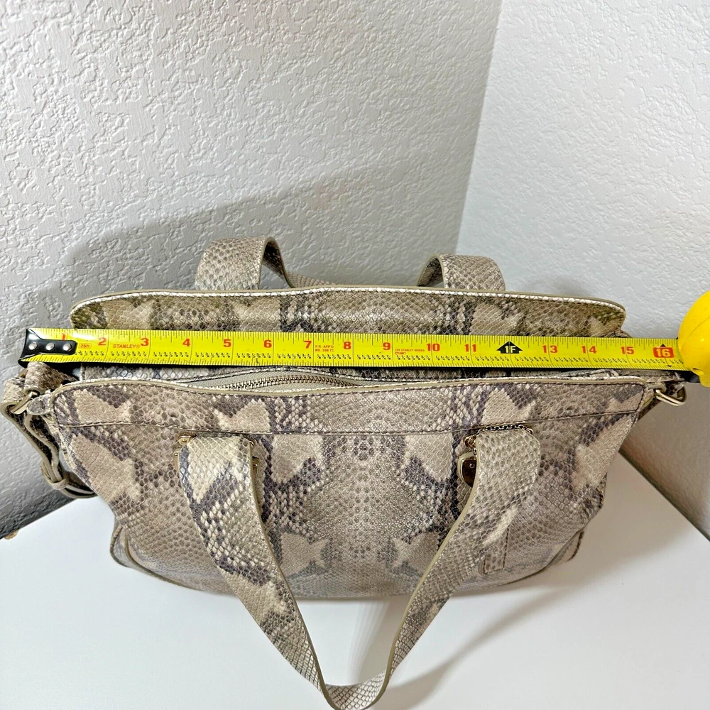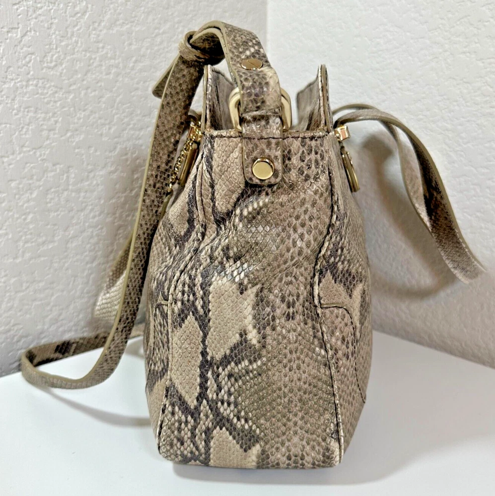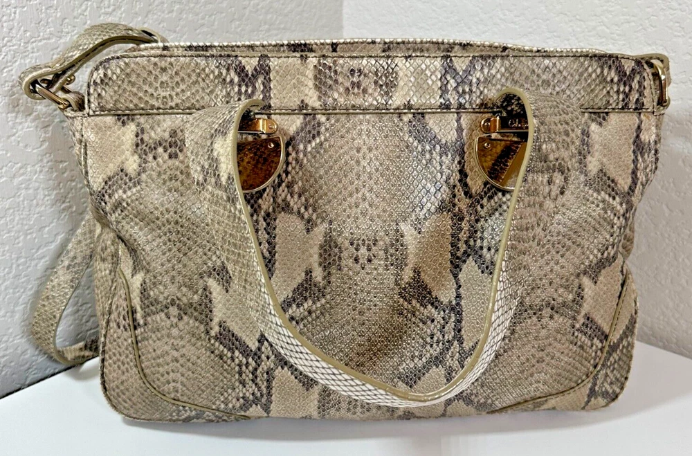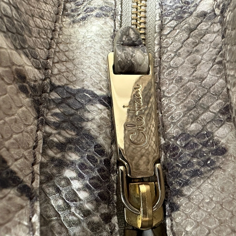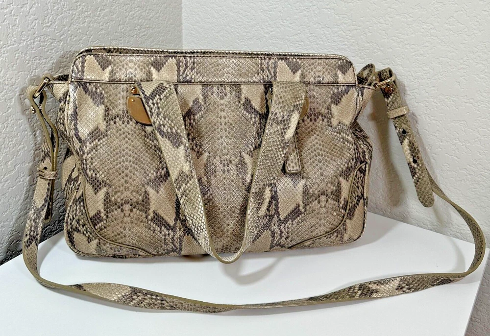 Cole Haan Faux-Snakeskin Embossed Crossbody Purse Bag Christmas Holiday Size Medium Approximate Measurements (inches): Width: 15" Height: 10.25" Depth: 6" Handle Drop: 8" Strap Drop: 17.5" to 19" This purse would make a beautiful addition to your collection! Features: -1 zippered interior pockets -2 interior slip pockets -1 keychain clip -Adjustable crossbody strap, 3 length options w/ a strap drop between 17.5" to 19" Pre-loved & in fair/good used condition. Some staining on lining in places. Some minimal signs of wear on outer surface. See photos for close ups & measurements. Ready to ship!