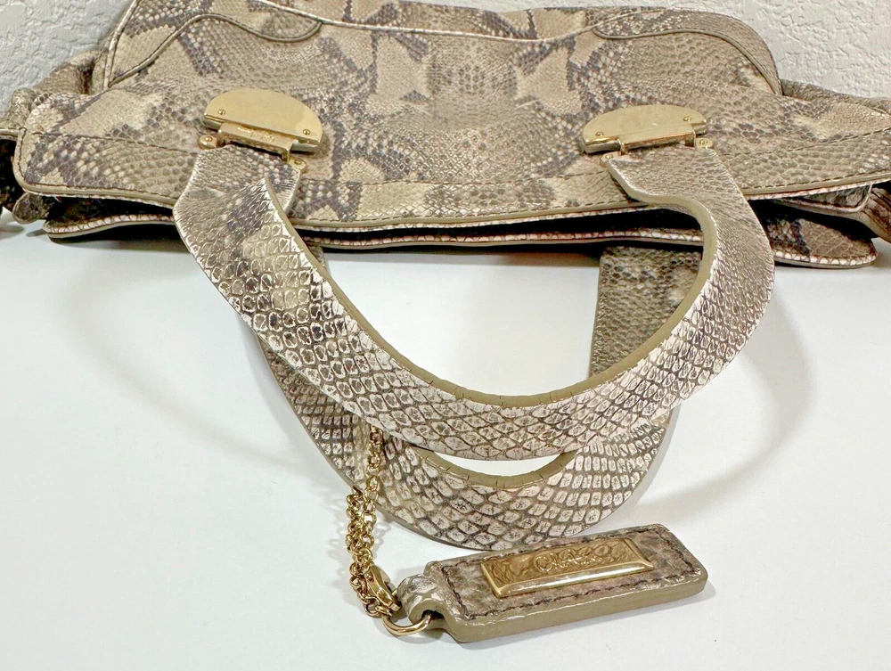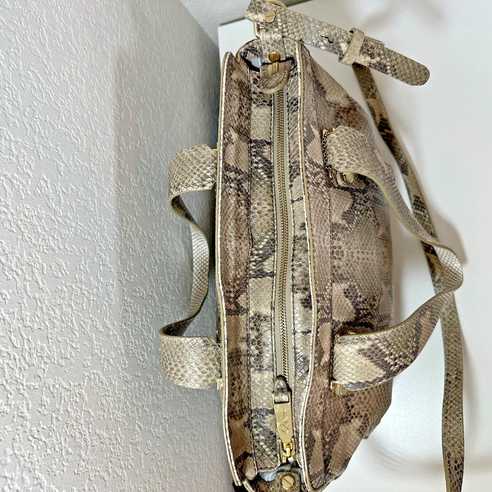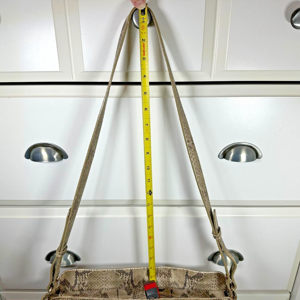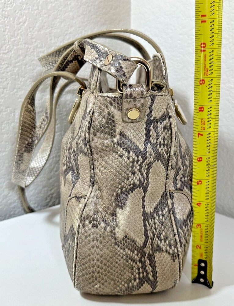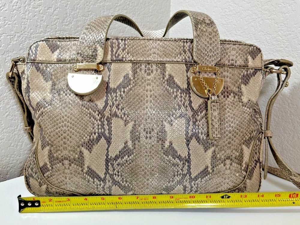 Cole Haan Faux-Snakeskin Embossed Crossbody Purse Bag Christmas Holiday Size Medium Approximate Measurements (inches): Width: 15" Height: 10.25" Depth: 6" Handle Drop: 8" Strap Drop: 17.5" to 19" This purse would make a beautiful addition to your collection! Features: -1 zippered interior pockets -2 interior slip pockets -1 keychain clip -Adjustable crossbody strap, 3 length options w/ a strap drop between 17.5" to 19" Pre-loved & in fair/good used condition. Some staining on lining in places. Some minimal signs of wear on outer surface. See photos for close ups & measurements. Ready to ship!