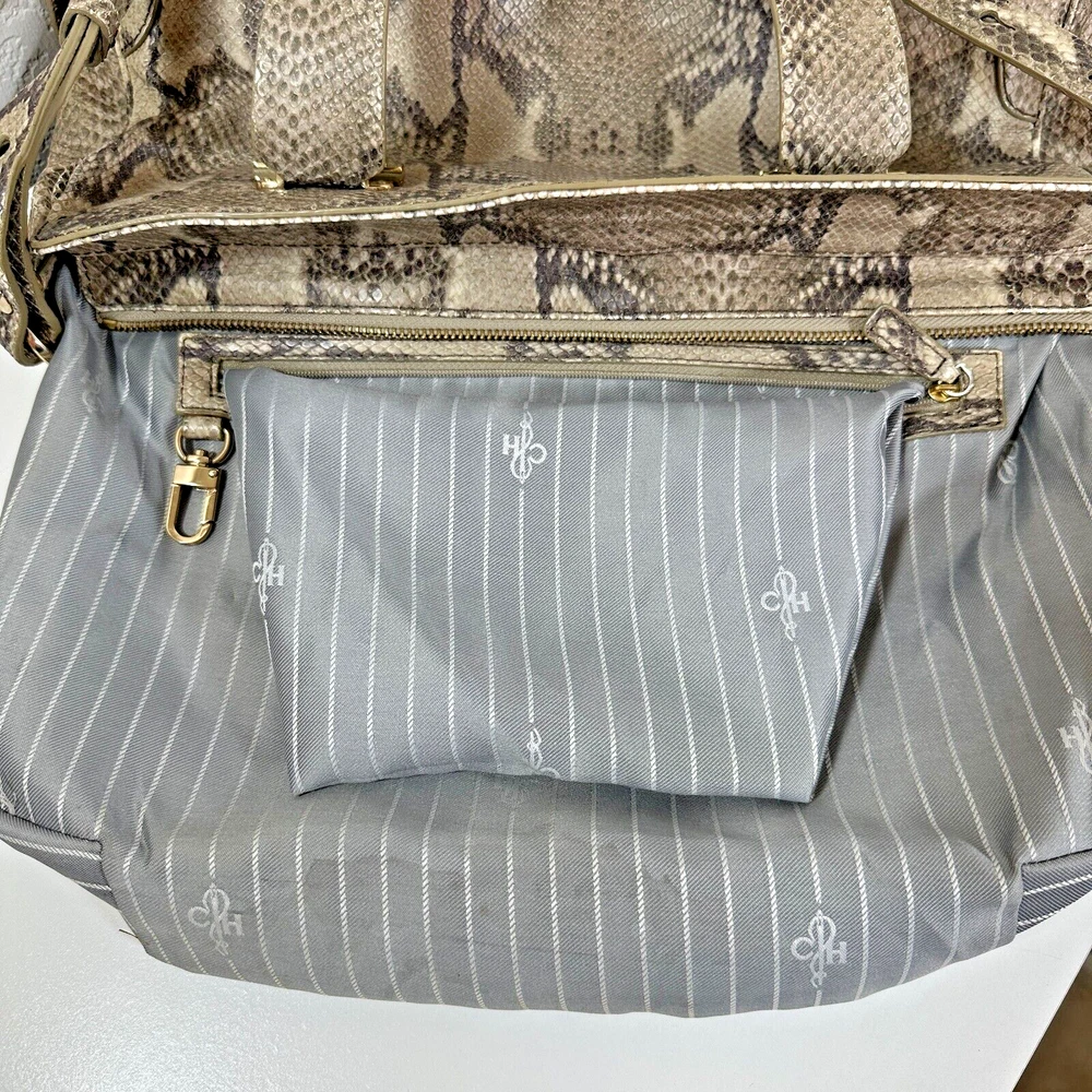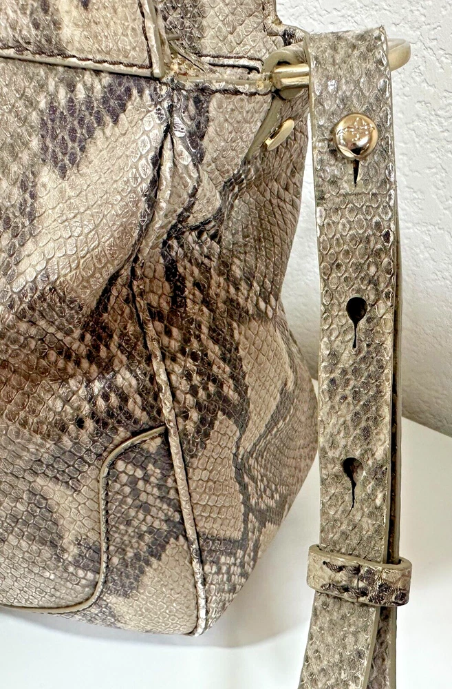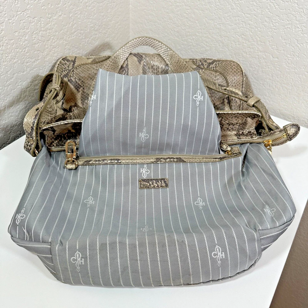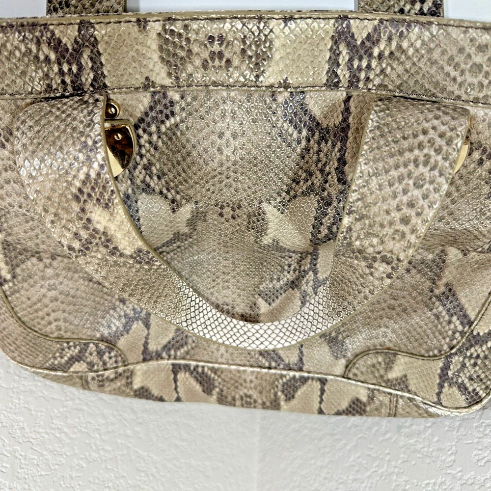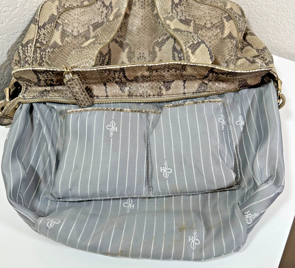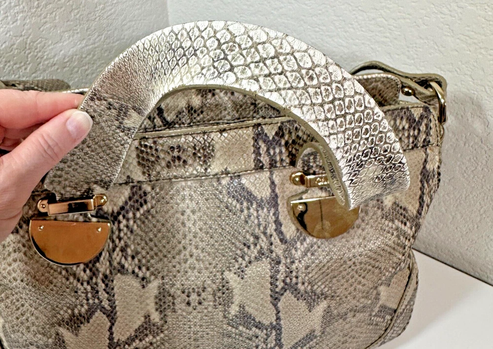 Cole Haan Faux-Snakeskin Embossed Crossbody Purse Bag Christmas Holiday Size Medium Approximate Measurements (inches): Width: 15" Height: 10.25" Depth: 6" Handle Drop: 8" Strap Drop: 17.5" to 19" This purse would make a beautiful addition to your collection! Features: -1 zippered interior pockets -2 interior slip pockets -1 keychain clip -Adjustable crossbody strap, 3 length options w/ a strap drop between 17.5" to 19" Pre-loved & in fair/good used condition. Some staining on lining in places. Some minimal signs of wear on outer surface. See photos for close ups & measurements. Ready to ship!