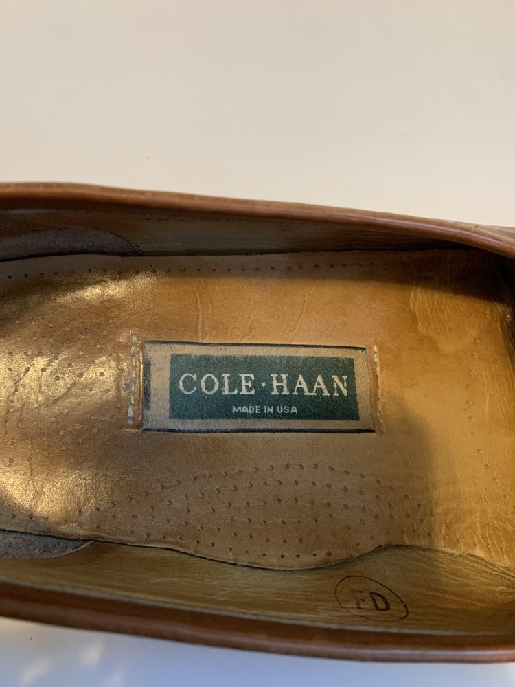 The Cole Haan Men's Brown Leather Kiltie Tassel Loafers are a stylish and classic slip-on option for men. Made in the USA with genuine leather, these loafers feature a round toe shape and tasseled accents. The vintage design adds a touch of preppy and designer style to your wardrobe, making them a versatile choice for any season. With a solid brown color and a comfortable leather lining and insole, these loafers are perfect for a dressy look or smart-casual outfit.