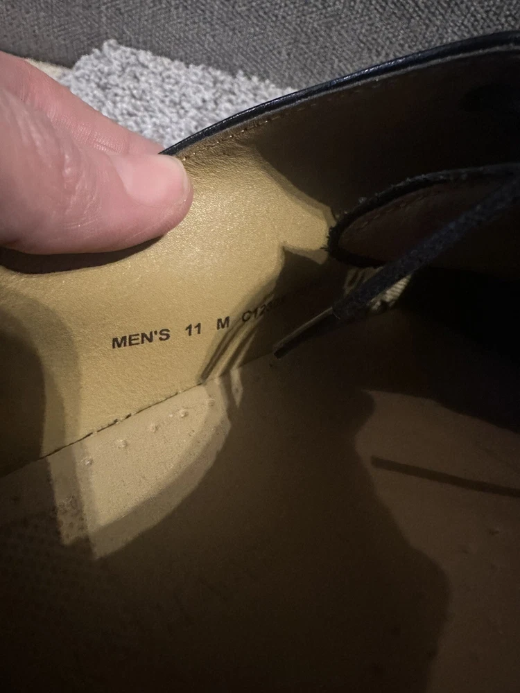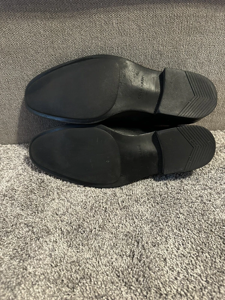 Elevate your formal attire with these Cole Haan black leather oxford dress shoes. Crafted with premium leather, these shoes feature an almond toe shape and lace-up closure for a sleek and polished look. The wingtip design and solid pattern add a touch of sophistication, making them perfect for any dressy occasion. These shoes are available in US size 11 and UK size 10, with a medium shoe width. The rubber outsole provides excellent grip and durability, while the leather lining and insole ensure comfort and breathability. Add these timeless shoes to your collection and step out in style. Preowned Good Condition