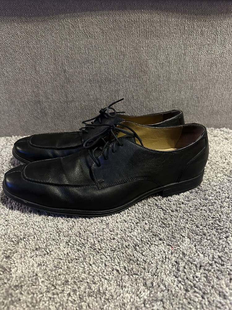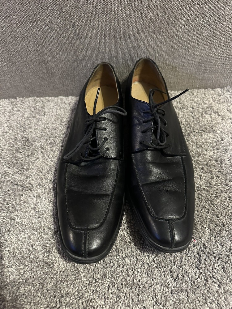 Elevate your formal attire with these Cole Haan black leather oxford dress shoes. Crafted with premium leather, these shoes feature an almond toe shape and lace-up closure for a sleek and polished look. The wingtip design and solid pattern add a touch of sophistication, making them perfect for any dressy occasion. These shoes are available in US size 11 and UK size 10, with a medium shoe width. The rubber outsole provides excellent grip and durability, while the leather lining and insole ensure comfort and breathability. Add these timeless shoes to your collection and step out in style. Preowned Good Condition
