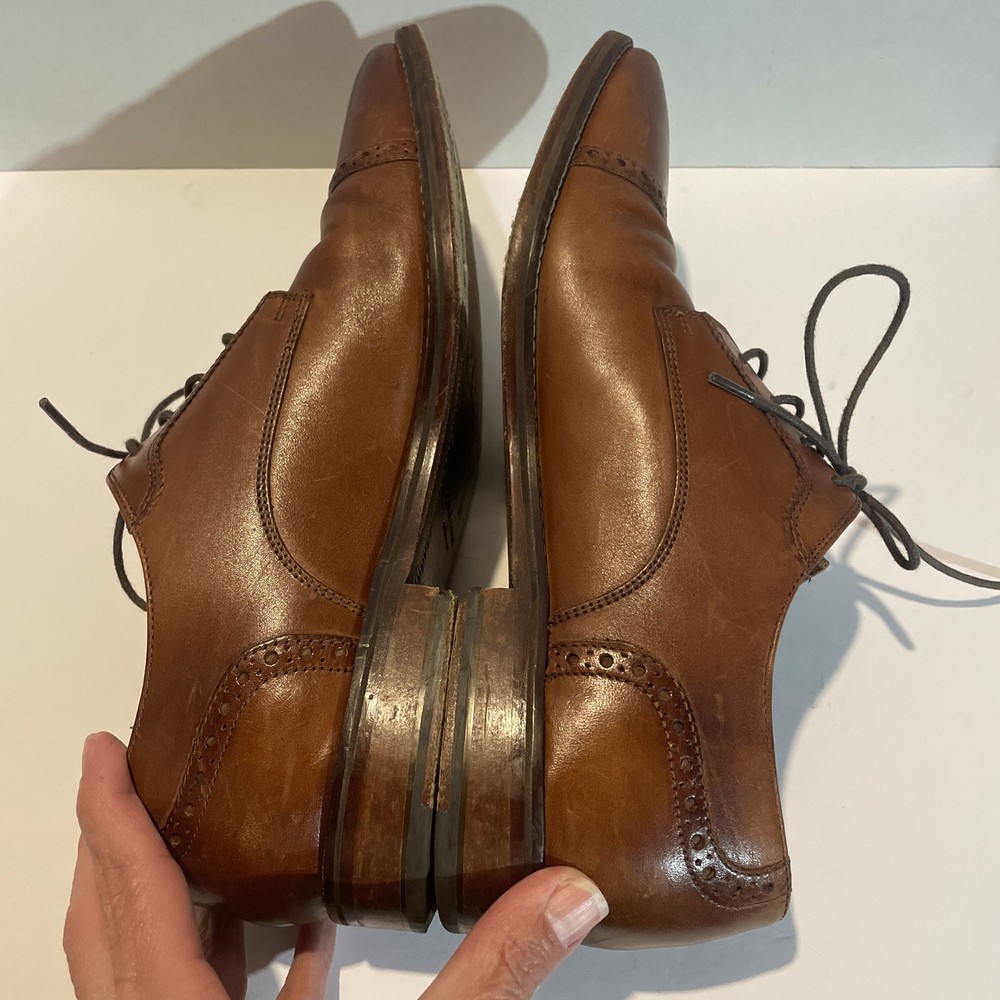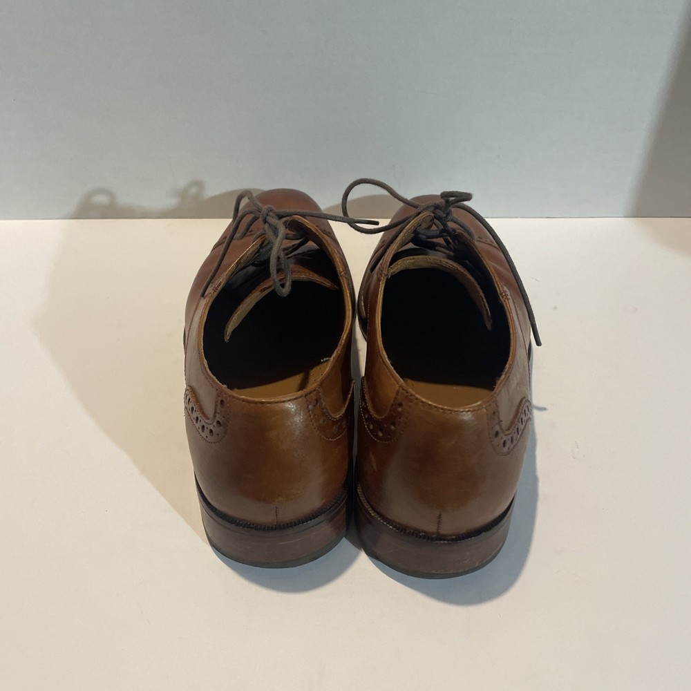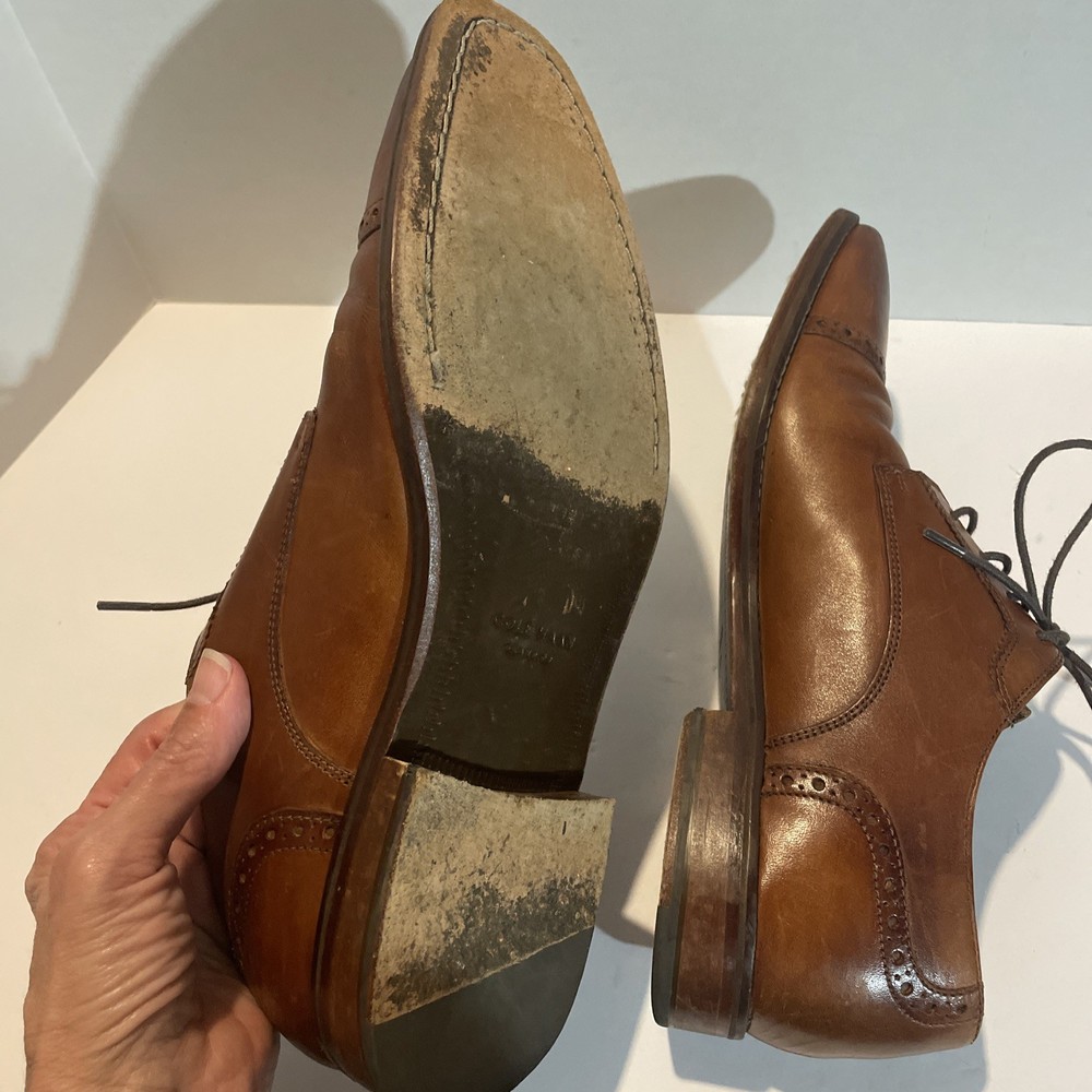 The product is a pair of Cole Haan Men's Brown Leather Oxfords Shoes in size 9.5. These shoes feature an almond toe shape, lace-up closure, and wingtip accents. Made of leather with a leather lining, they are stylish and versatile for any season. The shoes also have a solid brown color with a classic Oxford style, perfect for a city-themed look. The Cole Haan brand is known for quality and sophistication, making these shoes a great addition to any man's wardrobe.