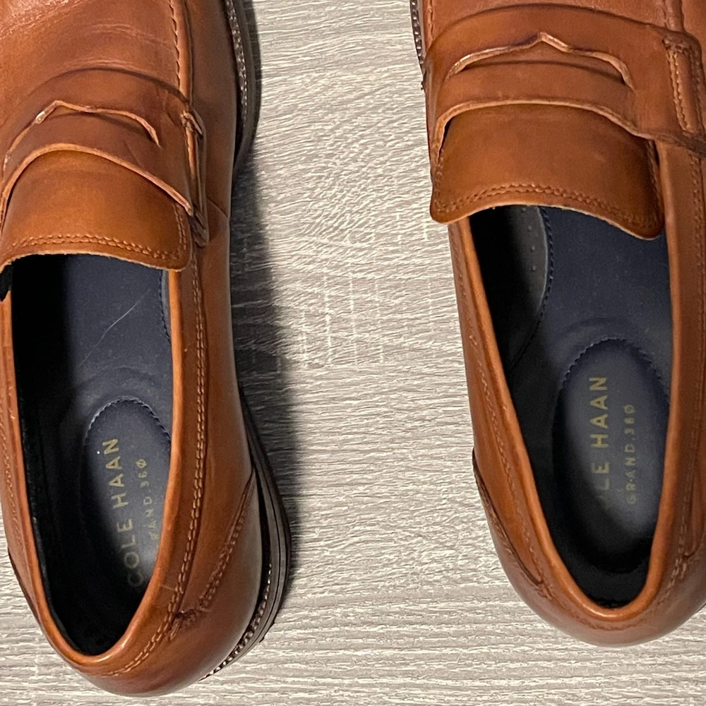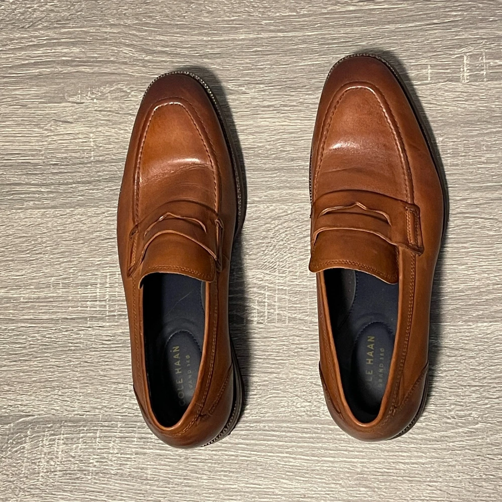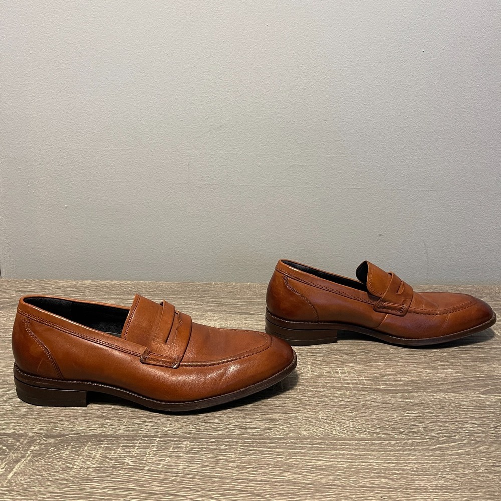 The Cole Haan Men's Grand 360 Warner Grand Penny Loafer in Brown is a stylish and sophisticated dress shoe for men. Featuring an almond toe shape and a slip-on closure, these loafers are crafted with leather lining and outsole material. The classic brown color and leather upper make them versatile for various seasons such as summer, fall, and spring. The Cole Haan Grand product line ensures quality and comfort, making these loafers a great addition to any man's wardrobe.