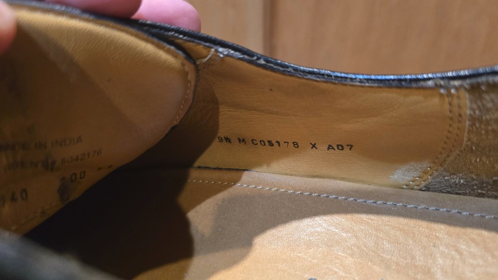 The product is a pair of used Cole Haan men's oxford dress shoes in size 9.5. The black leather shoes feature a solid pattern, cap toe shape, and lace-up closure. Designed for dressy occasions, the shoes come with their original box and are made with high-quality leather, making them a stylish and classic addition to any man's wardrobe.