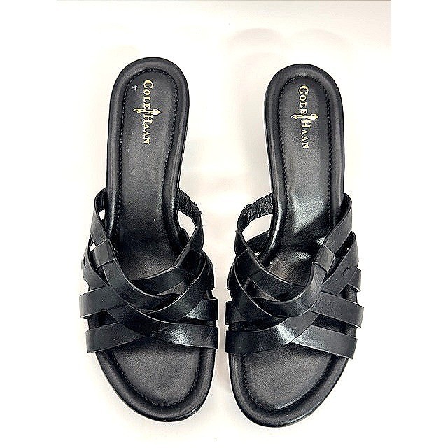 Cole Haan Nike Air wedge sandals combine classic style with athletic-inspired comfort. These black leather slides feature a sophisticated strappy caged upper and a sturdy wedge heel for a boost in height without sacrificing stability. The outsoles are equipped with Nike Air technology for superior cushioning, making them ideal for all-day wear. Finished with a textured rubber sole for reliable traction, these versatile sandals pair perfectly with everything from summer dresses to casual denim.