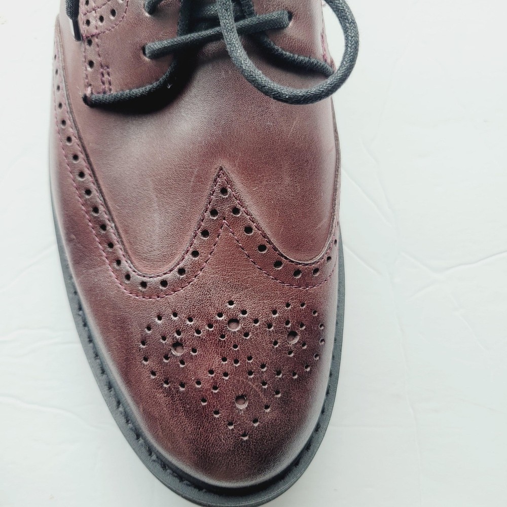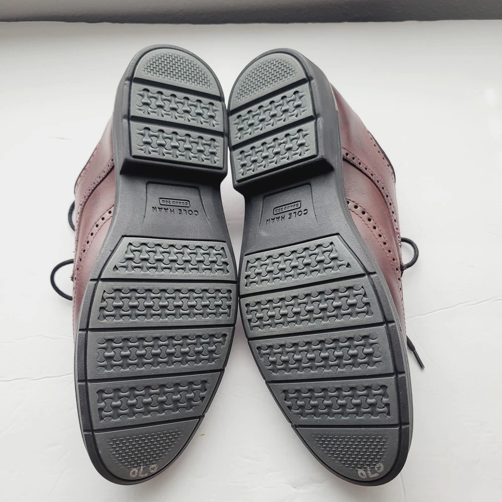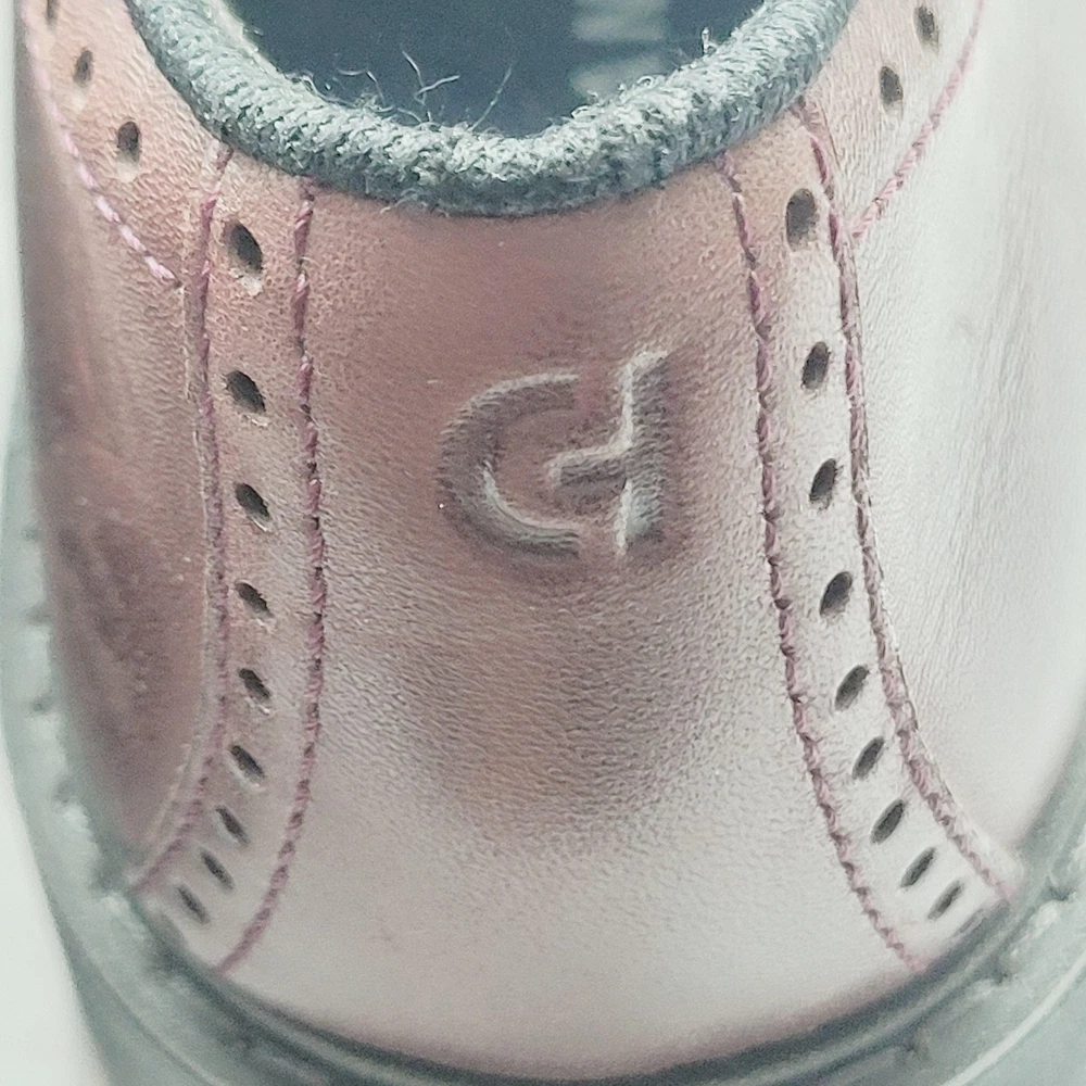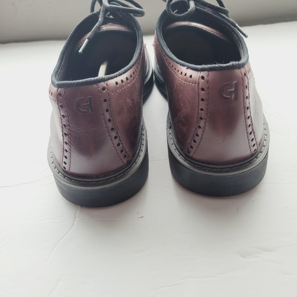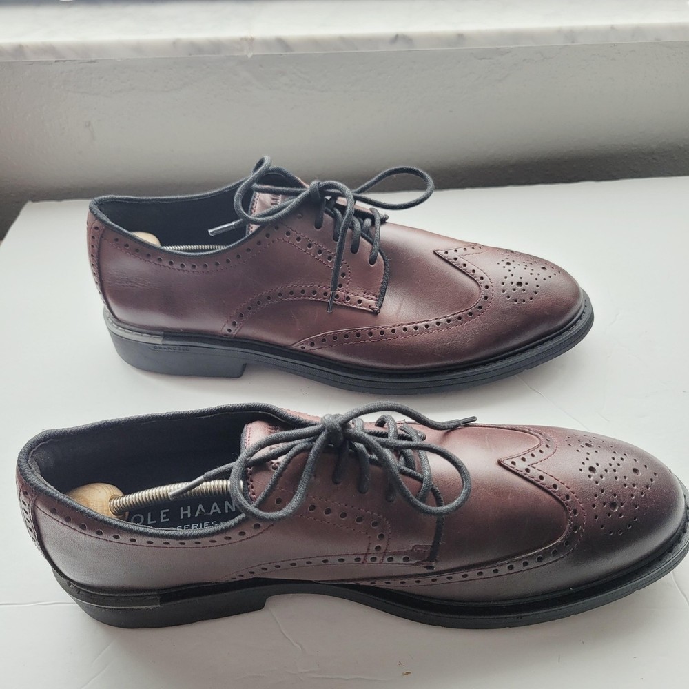 Brand: Cole Haan Line/Series: Grandseries with Grand 360 outsole Item: Wingtip Oxford Shoes with brogue perforations and lace-up closure Gender/Size: Mens 11M (US) Color: Burgundy Logos/Markings: CH embossed on heels; COLE HAAN GRANDSERIES on insole; COLE HAAN GRAND 360 on outsole Style/Model Code (inside print): C34122 Additional codes (inside print): 275965 E53 Materials (per tag):Leather Upper/ Lining: manmade Country of origin (per tag): Made in Vietnam Outsole: Textured rubber Grand 360 traction pattern Design features: Classic wingtip toe, brogue details, padded collar trim Notes: Please review photos for details of color and design.
