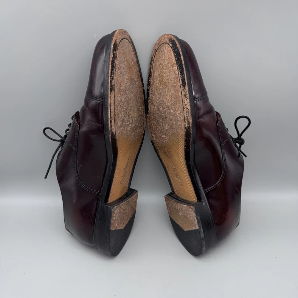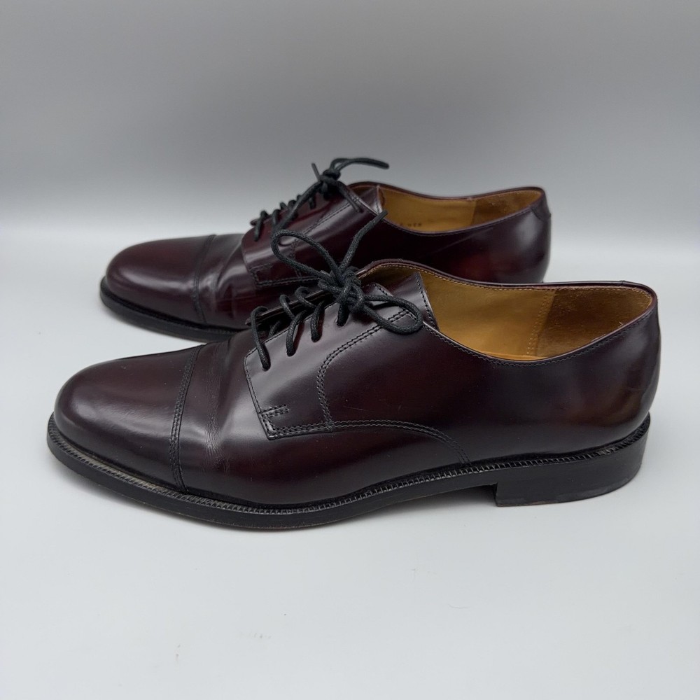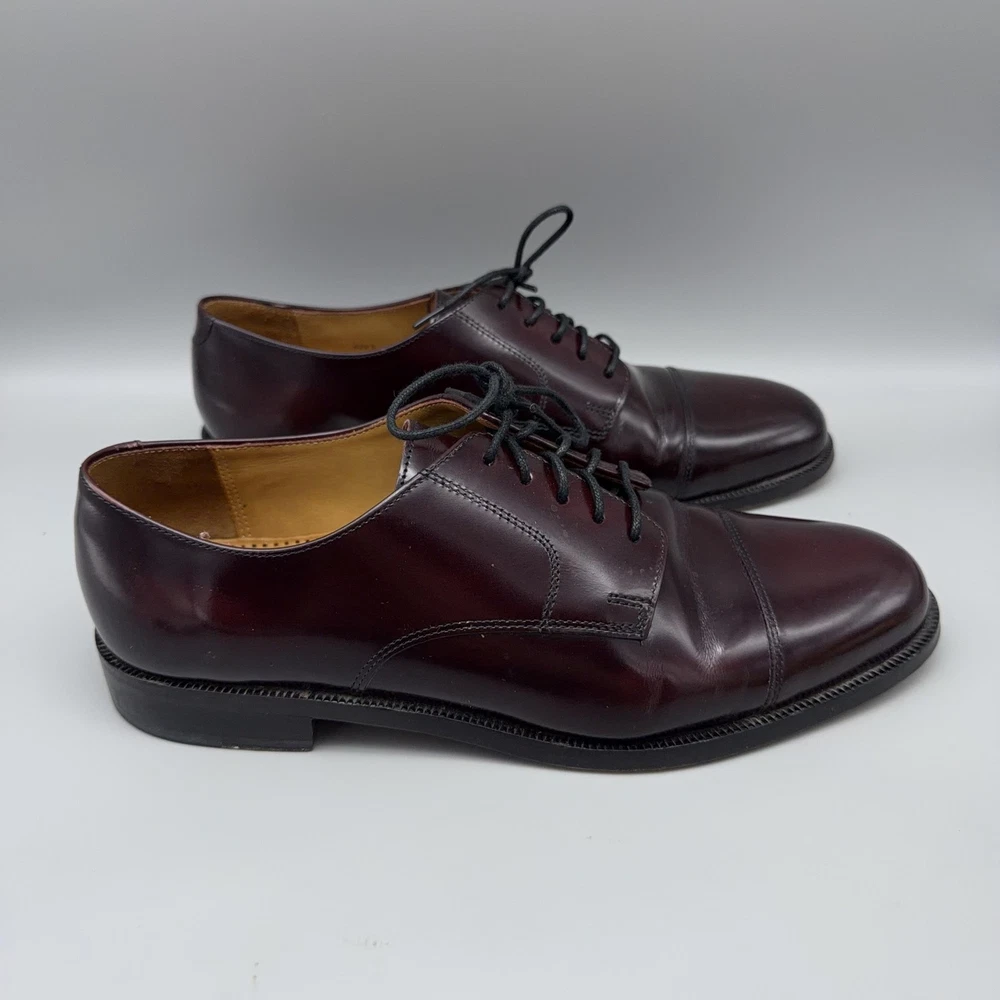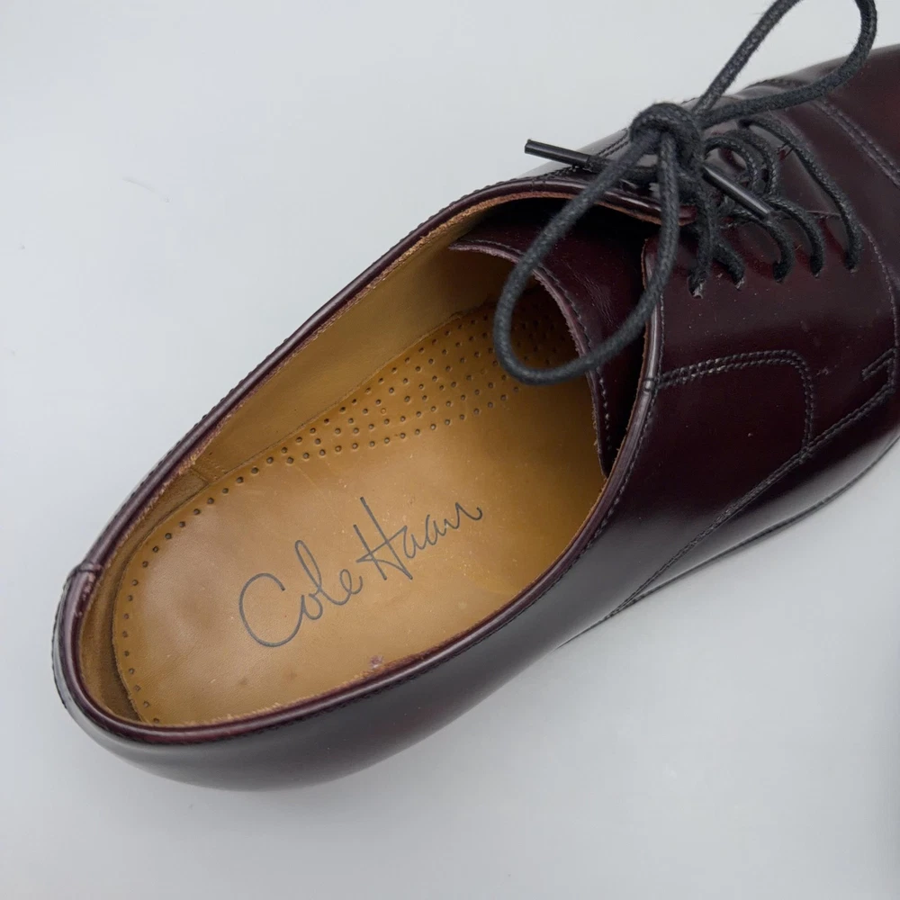 Cole Haan Shoes Mens Size 9 Burgundy Cap Toe Oxford Leather Dress Formal Lace Up Previously worn pair. Leather uppers are clean with light creasing and a few small surface scuffs. Leather soles show moderate wear and darkening at forefoot and heels but remain solid; laces and interiors intact. Brand: Cole Haan Style: Mens cap toe oxford dress shoes with closed lacing and sleek round toe. Color: Burgundy / oxblood. Size: Mens 9D as stamped on interior. Materials: Leather uppers, leather outsoles with rubber heel caps, leather lining and insole. Country of manufacture: Made in India. Style/Model codes printed inside: 08331 ULD and 500640 07 467. Details: Five-eyelet lace-up closure, cap toe design, stacked heel, Cole Haan script logo on insole and outsole. 659 Measurements: - Previous washings may change the sizing written on the tag. - Please refer to the photos above for all measurements. - Please compare our measurements to that of one of your favorite garments. - Please note, item measurements are approximate . All items are bagged and sealed after being photographed, then stored in a smoke free environment to ensure the item is exactly the same as when photographed. All items have been cleaned per eBay standards & policies. I carefully package and ship daily. Feel free to contact me with any questions.