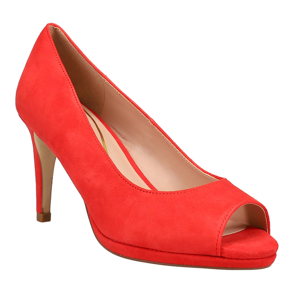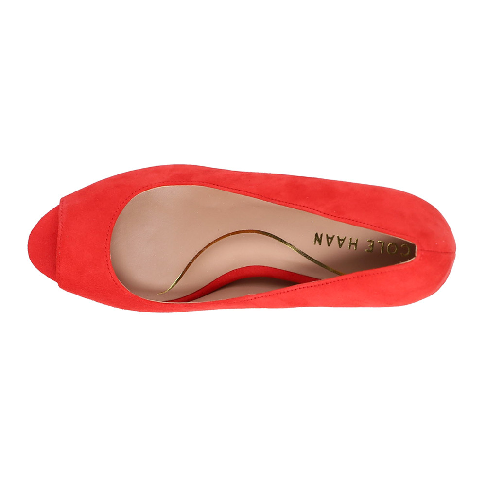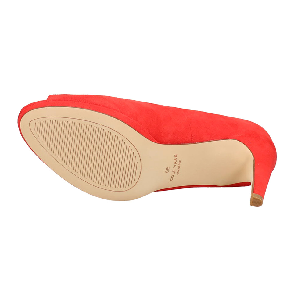 Drado Peep Toe Stiletto Pumps Product Details Leather upper 3.25 inch heel, 1.25 inch platform Cushioned footbed with arch support Rubber outsole A slim platform and heel elevate this sophisticated peep toe pump that offers comfort and support with every step thanks to signature Grand360 cushioning. Additional Details Color: Red Occasion: Dress Gender: Womens Age: Adult Brand: Cole Haan