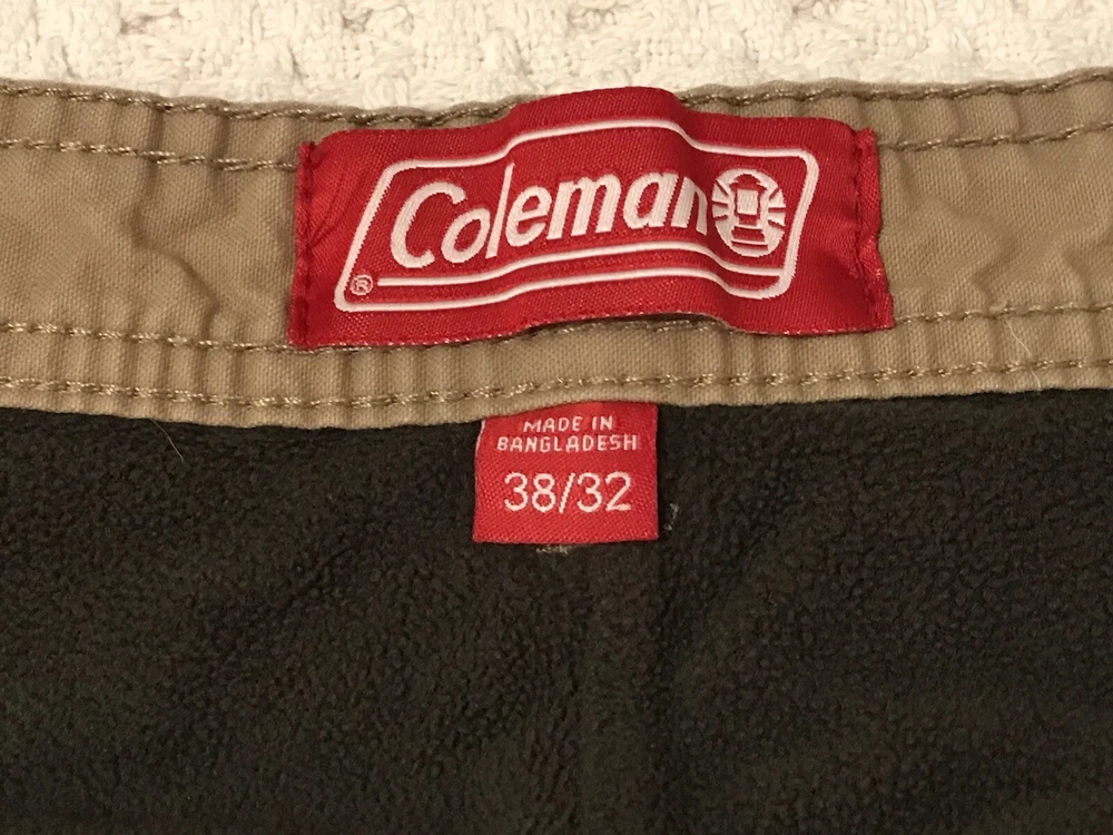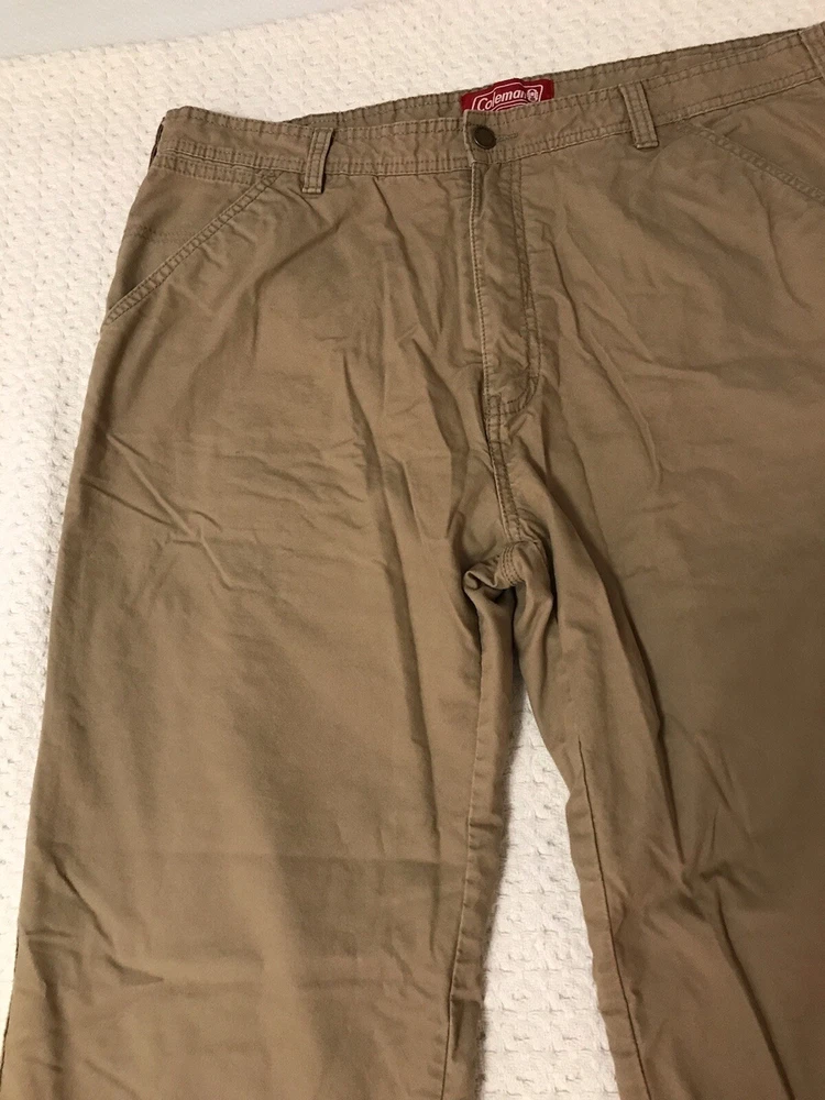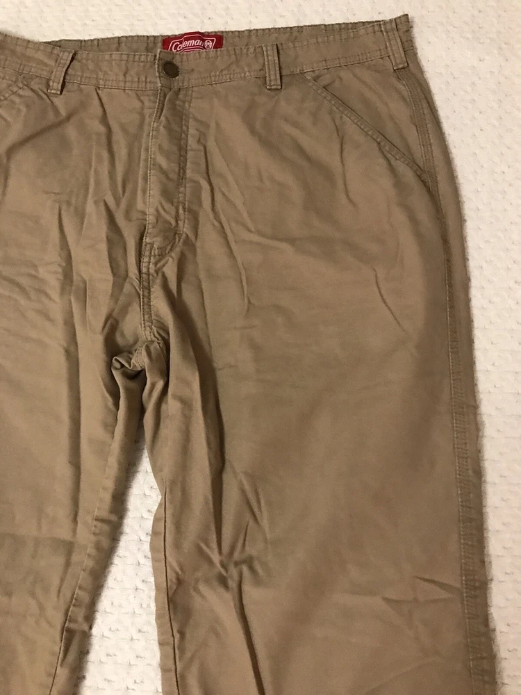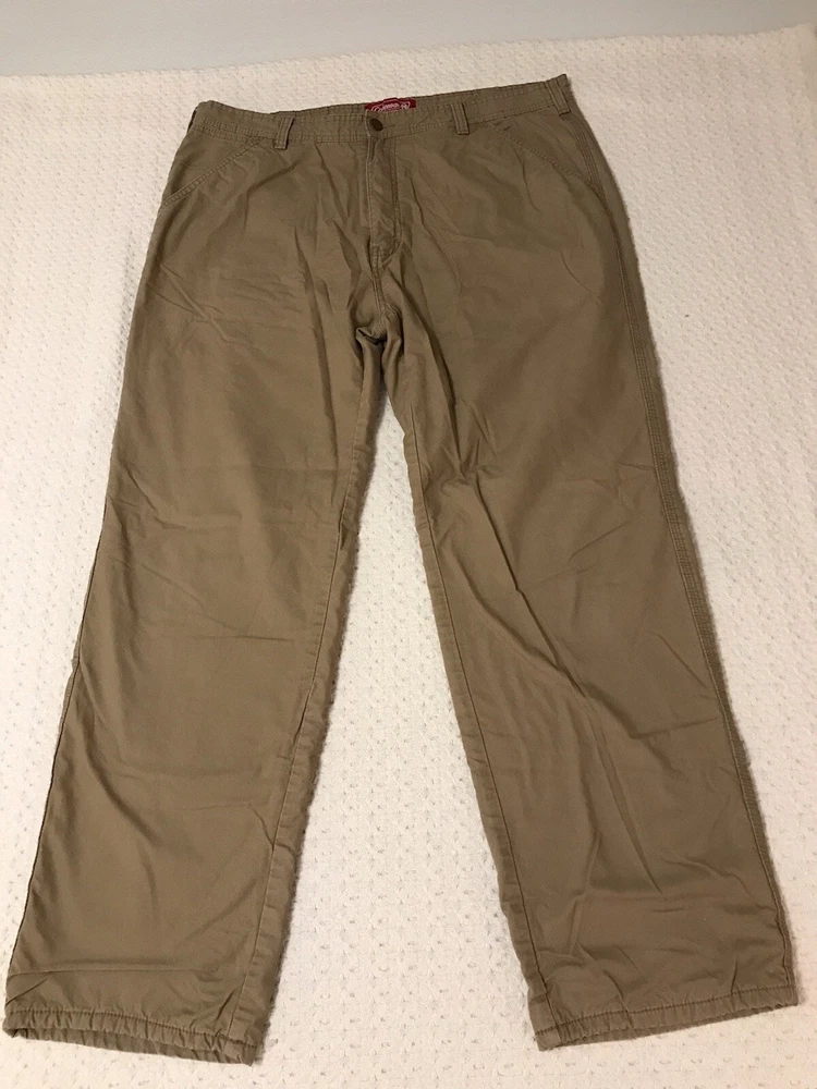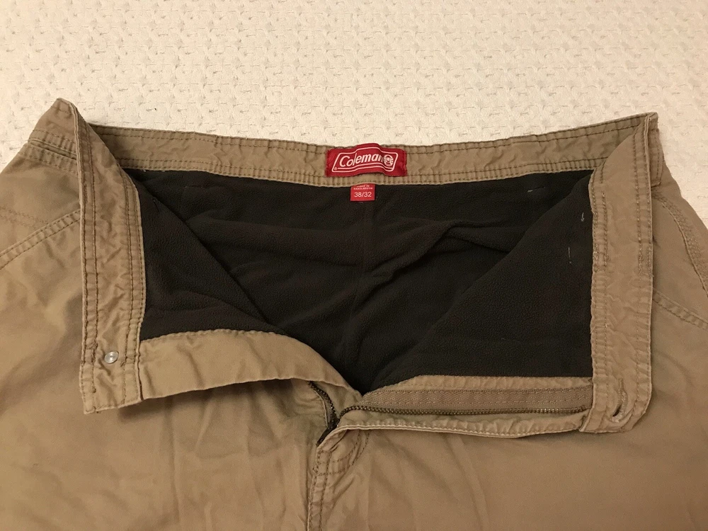 Closure: Zip Size: 38 Fit: Regular Rise: Mid (10-12 in) Waist Size: 38 in Leg Style: Straight Brand: Coleman Pocket Type: 5-Pocket Design Material: Cotton, Polyester Fabric Type: Fleece Department: Men Style: Work Pants Season: Fall, Spring, Winter Color: Beige Type: Pants Front Type: Flat Front Size Type: Regular Theme: Nature, Camping, Hiking, Outdoor, Trekking Features: Comfort, Easy Care, Lined, Pockets Pattern: Solid Inseam: 30 in Occasion: Casual, Travel, Workwear