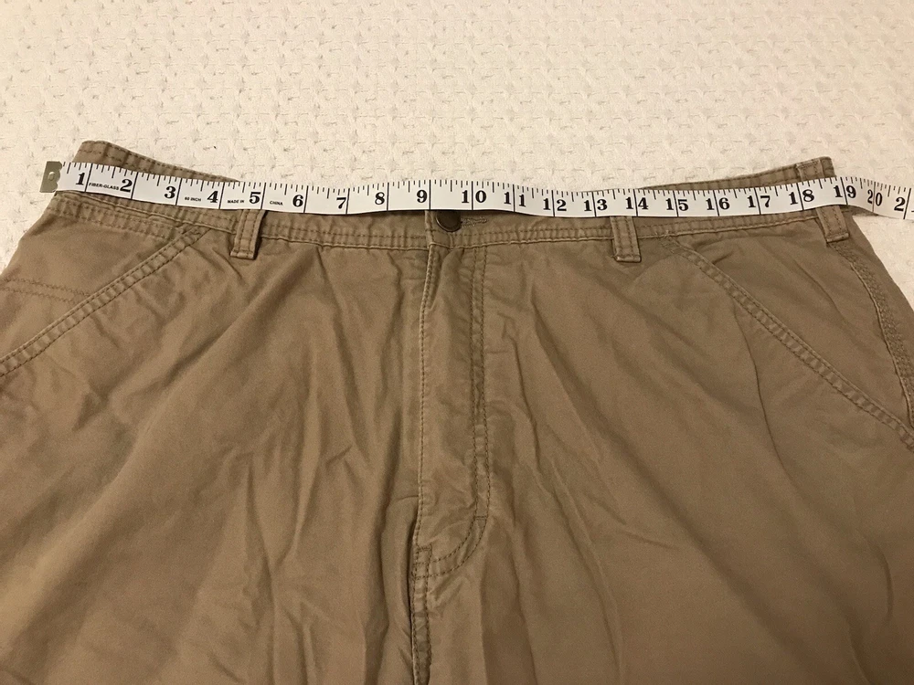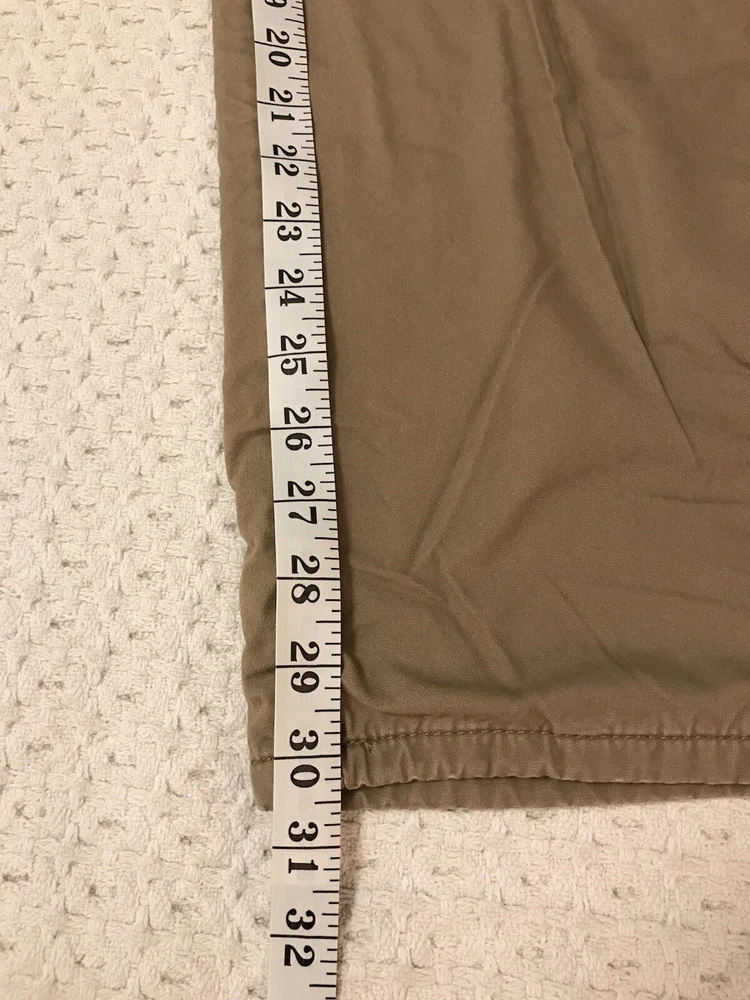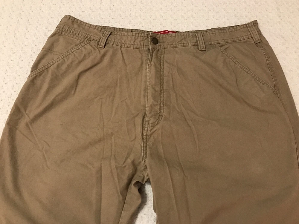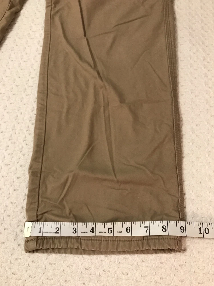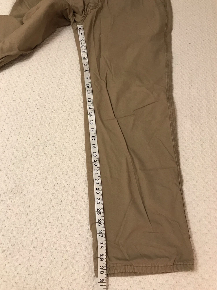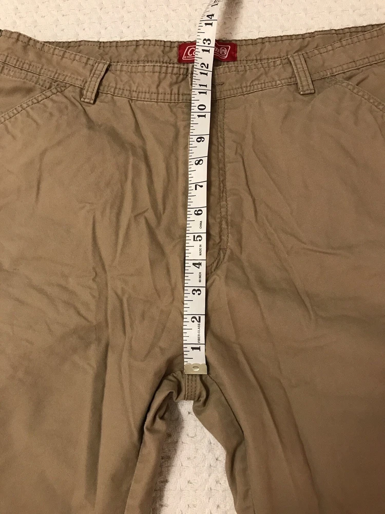 These Coleman work pants are perfect for any outdoor adventure, whether it be hiking, trekking, camping or just enjoying nature. The pants are made of a comfortable and durable polyester-cotton blend with a solid pattern and a fleece lining to keep you warm during the colder seasons. The 5-pocket design provides ample storage for all your belongings and the flat front and straight leg style offer a classic and versatile look. The pants have a zip closure and a waist size of 38 inches, with an inseam of 30 inches. Garment tag shows an inseam of 32 inches, but the measurements show an actual inseam of 30 inches. Rise is 12 inches. They come in a khaki tan color and feature easy care and comfort, making them suitable for travel, casual wear and workwear occasions. This is a great addition to any outdoor enthusiast's wardrobe. In a smoke free home. No tears or holes.