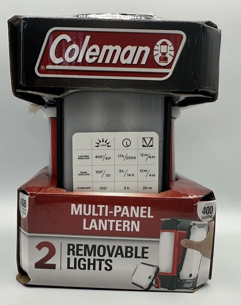 Introducing the Coleman Multi-Panel LED Lantern, a perfect addition to your camping or hiking gear. This lantern features two removable lights with a total brightness of 400 lumens, providing ample light for any outdoor activity. The lantern is powered by a USB port and is made of durable ABS material, ensuring long-lasting use. The lantern's multicolor design adds a touch of style to your adventure, while its rechargeable feature allows for convenient charging. With a height of 7 inches, the lantern is compact and easy to carry. Its LED lighting technology is energy efficient and environmentally friendly. Get ready to explore the great outdoors with the Coleman Multi-Panel LED Lantern.