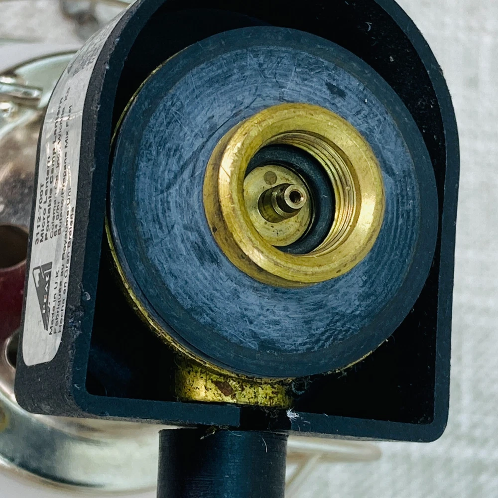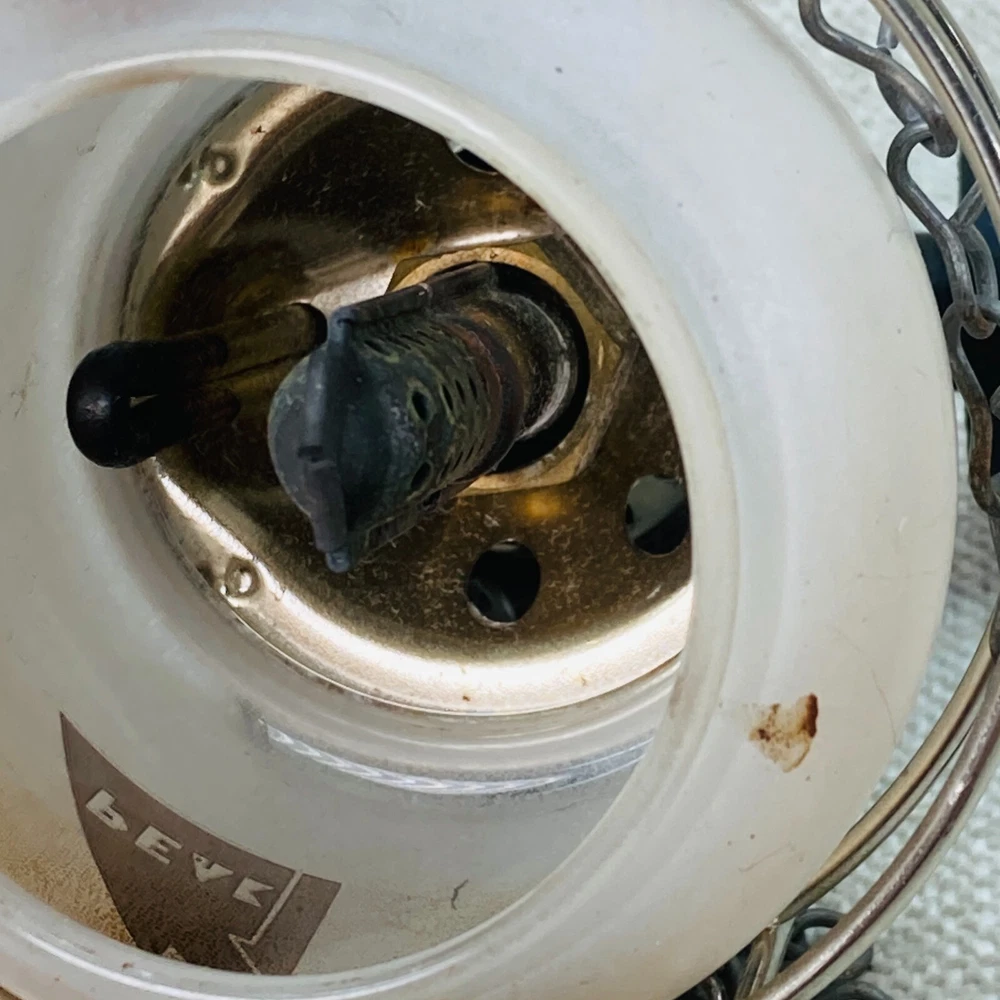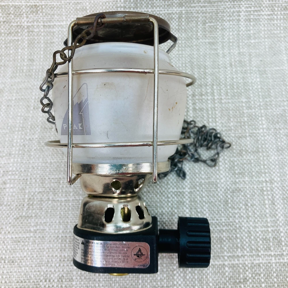 This is a vintage Coleman Peak 1 Single Mantle Micro Lantern that runs on butane/propane gas. It is black in color and made of plastic and metal. The lantern is compact, with dimensions of 5 inches in height, 4 inches in length, and 3 inches in width. It features gas lighting technology and can support 1-3 lights. Please note that mantles are not included with this lantern.