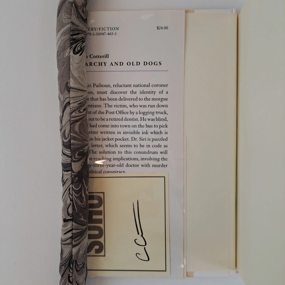 ANARCHY AND OLD DOGS [Signed] Author: Cotterill, Colin Title: ANARCHY AND OLD DOGS [Signed] Publication: New York, New York: Soho Crime, 2007 Edition: First Edition, First Printing Description: Small octavo, 272 pages. In Very Good condition with Near Fine condition dust jacket. Spine is white and brown with lavender and white lettering. Dust jacket protected by mylar covering, price uncut: "$24.00" on front flap. Boards have mild shelving wear along spine tail. Signed flat by Colin Cotterill on a loose bookplate contained between mylar covering and front flap of dust jacket. Shelved in hallway. Seller ID: 1390859 Subject: Literature Welcome to the eBay store of Second Story Books! DC's Oldest Rare and Used Bookstore, Second Story Books operates two open shops in the Washington D.C. metropolitan area. We have an extensive internet presence and provide accredited appraisals member ASA. This listing was created by Bibliopolis.