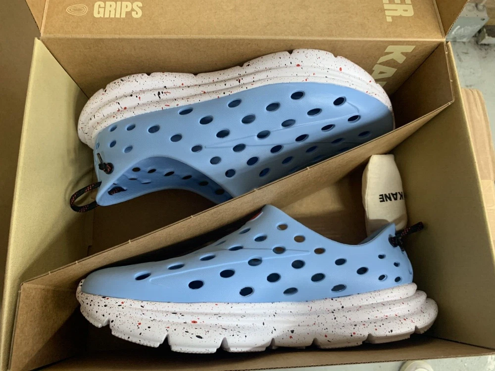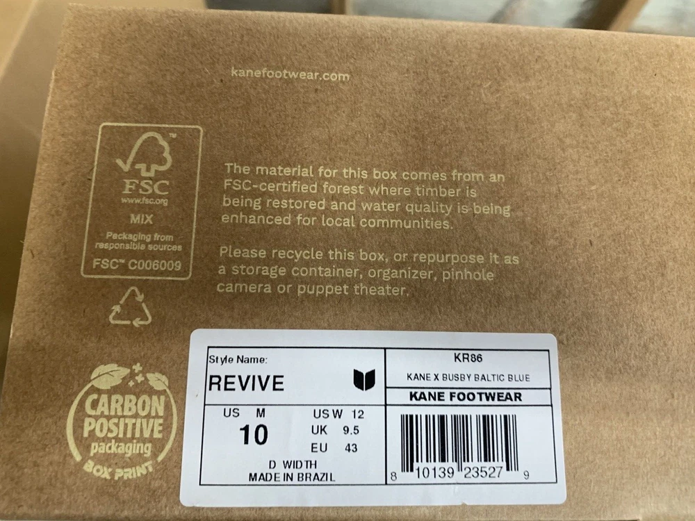 Brand new with box Men's size 10, Women's size 12 All sales are final, no returns Fast shipping! KANE Revive shoes are made of bio-based closed-cell RestoreFoam™. The shoes don’t absorb moisture, so they’re just as functional in water as they are on land, and they’re quick-drying. The KANE Revive shoes can easily be wiped or washed off with soap and water. Please avoid exposure to extreme heat or sun for this can cause the shoes to shrink or warp. Dishwashers, washing machines, or hot cars can also cause the shoes to shrink or warp. The KANE Revive sizing follows the standard sizing for a running shoe. Therefore, the size guide should be utilized according to your typical running shoe size. IN BETWEEN SIZES? We recommend sizing down (ex. if you typically wear size 10.5 - select size 10). For a wider foot, go one half size up (ex. if you typically wear size 10.5 - select size 11).