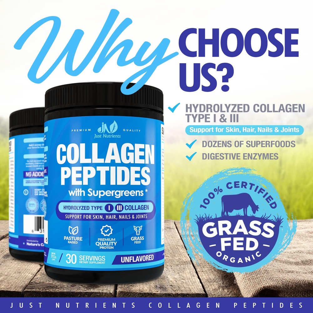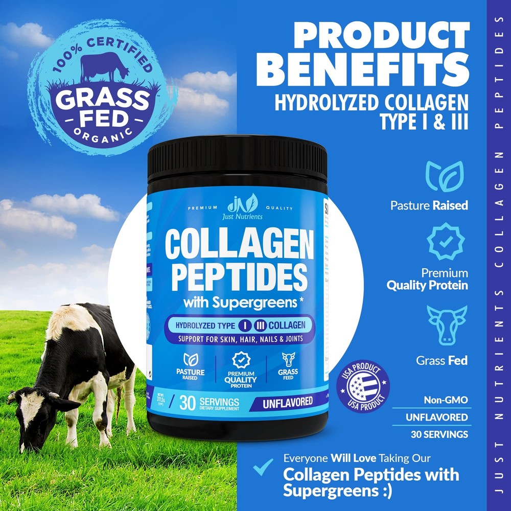 Introducing Collagen Peptides with Supergreens, the perfect solution for those looking to nourish their hair, skin, nails, and joints. This premium blend is packed with natural ingredients that work together to support overall wellness. Key Benefits: Hydrolyzed Collagen Type I & III: The formula is made with premium collagen peptides that are easily absorbed by the body, providing essential amino acids that support the of hair, skin, nails, and joints. Superfoods: Our Collagen Peptides is infused with superfoods, including kale, spinach, and broccoli, that help to boost energy and provide vital nutrients. Digestive Enzymes: We’ve added digestive enzymes to our formula to aid in the absorption of nutrients, so you can get the most out of every serving. Grass-Fed & Non-GMO: Our collagen is sourced from grass-fed, pasture-raised cows, and is free from GMOs, hormones, and antibiotics. Unflavored: Our unflavored formula is perfect for those who prefer a neutral taste and want to add it to their favorite smoothie or recipe. With 30 servings per container, our Collagen Peptides with Supergreens is an easy and convenient way to support your overall wellness. Whether you’re an athlete, a busy professional, or a stay-at-home parent, our premium blend can help you look and feel your best. Don’t wait any longer to support your and wellbeing – try our Collagen Peptides with Supergreens today! HEALTHY HAIR, SKIN & NAILS - Improve your hair, skin, nails and joint with Collagen Peptides with Super Greens! Our proprietary instant absorption formula ensures that you get all the benefits of this premium protein blend quickly and effectively. EASY TO TAKE - Our unflavored collagen peptide is perfect for adding to your favorite drinks, smoothies, or recipes for a boost of nutrients. Plus, it contains digestive enzymes to help your body better absorb and utilize the protein. PREMIUM QUALITY - Our collagen is sourced from grass-fed and pasture-raised cows, ensuring the highest quality and ethical standards. Plus, the addition of super greens provides even more vitamins and minerals for overall wellness support. 30 SERVINGS PER CONTAINER - Each container includes 30 servings, giving you a full month's worth of collagen peptide to help you achieve your and beauty goals. Try it today and experience the benefits for yourself! NATURAL INGREDIENTS - Collagen Peptides with Super Greens are made with all-natural ingredients and contain no artificial sweeteners, colors, or flavors, making it a clean and healthy option for anyone looking to improve their overall wellness.