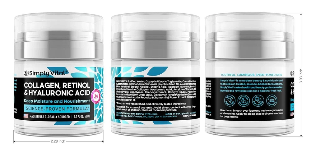 Nourishing Face Moisturizer — Enhance your anti-aging skincare routine with this moisturizing face cream, designed to help your skin feel smooth and refreshed. Collagen supports skin's flexibility while promoting a firmer texture for both face and neck. Enjoy a youthful glow with a gentle solution that provides enduring hydration and care. How to Use - Apply a small amount to clean, dry skin, massaging until absorbed. Start 1-2 times a week for sensitive skin, then increase as needed. Use daily for optimal results. Always apply SPF 30+ during the day, as retinol may heighten sun sensitivity. Perform a patch test before initial use. Consult a dermatologist before use. Individual sensitivity to components is possible. Advanced Retinol Face Cream – Formulated with a balanced concentration of retinol, this moisturizer encourages skin renewal for a smoother, refreshed appearance. Hyaluronic acid complements retinol to help maintain hydration, leaving skin feeling soft and nourished without tightness. Perfect for a well-rounded skincare routine. Proudly Made in the USA – SimplyVital guarantees exceptional quality in each jar. We carefully select effective yet gentle components to create potent formulas, ensuring your skin gets the attention it deserves while enhancing your natural elegance. All our products are crafted in the USA, adhering to the highest manufacturing standards. Product Description 1 Easy to use 2 How to use 1 FOR MATURE SKIN 2 NOURISH & HYDRATE 3 BENEFITS OF RETINOL 4 DEEP MOISTURE What precautions should beginners take when using retinol? Always do a patch test on your inner arm for 24 hours to check for irritation. Avoid the eye area. Use SPF 30+ daily, and consult a dermatologist before use. Do not use if you have any skin concerns. What is a patch test, and how do I perform it? A patch test helps detect allergies. Apply a small amount of product to your inner forearm and wait 24 hours. If no redness or irritation occurs, it’s safe to use on your face. Can I use SimplyVital Face Moisturizer if I have sensitive or dry skin? Individual intolerance may occur. Consult with your dermatologist. Start slowly, 1-2 times a week, then gradually increase. Always do a patch test before use. Stop if irritation or redness occurs. How soon can I expect to see results? Results vary, but most users see improvements in skin texture and appearance within 4-6 weeks of consistent use. I can't understand how to use the jar, how to get the cream from the pump? Remove the clear lid from the jar, gently press down on the white pump. If no cream appears, press a few times. This design keeps the cream fresh by limiting air exposure.