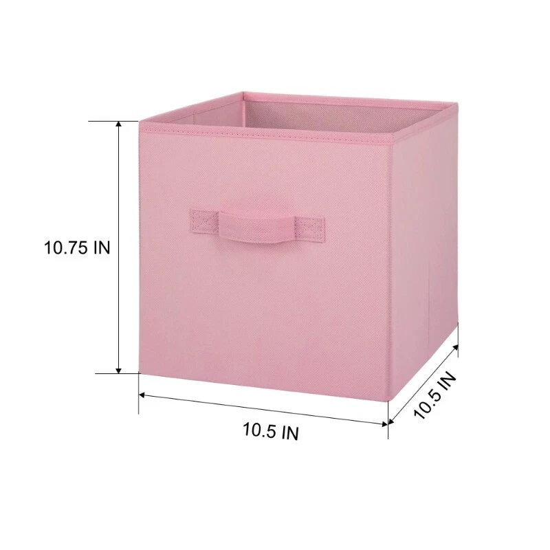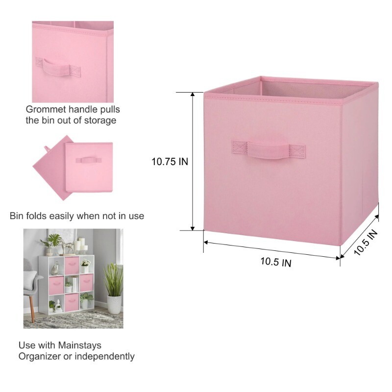 Our Mainstays Pink Puff Collapsible Fabric Storage Bins are just what you need to help you create an organized home. Perfect for storing kids to adult clothes, books, electronics and more, these bins' 10.5-inch by 10.5-inch by 10.75-inch size offers plenty of room to keep a wide variety of belongings neatly tucked away and their sturdy handle allows you to pull them off shelves with ease. You can utilize our Mainstays Storage Cube's organizational expertise in your living room, bedroom, laundry room, or dorm room. When not in use, you can easily fold the bin down flat and keep it stored away in your closet for later. The fabric storage cubes are made to fit with our Mainstays Cube Storage Organizers and are designed with a durable fabric that holds up over time. With a variety of colors to choose from, you'll be able to perfectly match your home decor when you get organized with our Mainstays Collapsible Fabric Storage Bins. Helps you to create an organized and comfortable home Includes 6 pink cube organizer bins Perfect for pairing with your favorite colors and patterns to mix and match Bin features an easy carry handle on the side that makes it easy to take the bin wherever you need to go Can be used with our Mainstays Cube Storage Organizer units or independently Cubes are collapsible when not in use to maximize your space Ideal for storing books or kids and adult clothing in the bedroom, living room, laundry room or dorm rooms Made of a durable fabric that won't crease easily, has good abrasion resistance and holds its shape Dimensions: 10.5" L x 10.5" W x 10.75" H (26.5 cm x 26.5 cm x 27.3 cm)