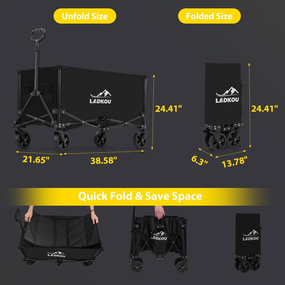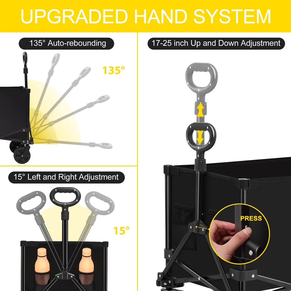 【Generous Capacity for Effortless Transport】 - With unfold full size: 37" (W) x 20" (D) x 40" (H), this foldable wagon has deeper and larger storage space than other standard-sized wagons, offering 140L carrying capacity. Allows you to transport sizable loads, reducing the need for multiple trips. 【Quick Fold & Space-Saving】 - This beach wagon cart with big wheels can be easily unfolded or folded in seconds without using tools, making it very easy to handle and transport. The portable and compact design perfect balance between large capacity and small folding size, you can take it anywhere with ease and store it in limited space. 【Durability for Longevity】 - Built to withstand outdoor conditions and heavy loads, Our folding heavy duty wagon is constructed with a heavy-duty steel tube frame, that effortless hold up to 330lbs. The double-layer 600d Oxford fabric is not only robust but also resists wear and tear, ensuring lasting performance and enduring quality. 【All-Terrain Wheels & Adjustable Handles】 - The collapsible wagon is equipped with 360° rotating off-road wheels, wear-resistant and silent, so it can move smoothly on different kinds of terrains. The 90° adjustable handle can be extended from 28" to 39.8" and locks securely in place. All for easy pushing and pulling! 【Versatility】 - This wagon is designed for versatility, catering to a range of activities. From camping, gardening, shopping, sporting events and outdoor activities, it’s a great outdoor utility wagon as a camping wagon, fishing wagon, or grocery wagon. Please feel free to contact us at any time, we will reply within 24 hours!