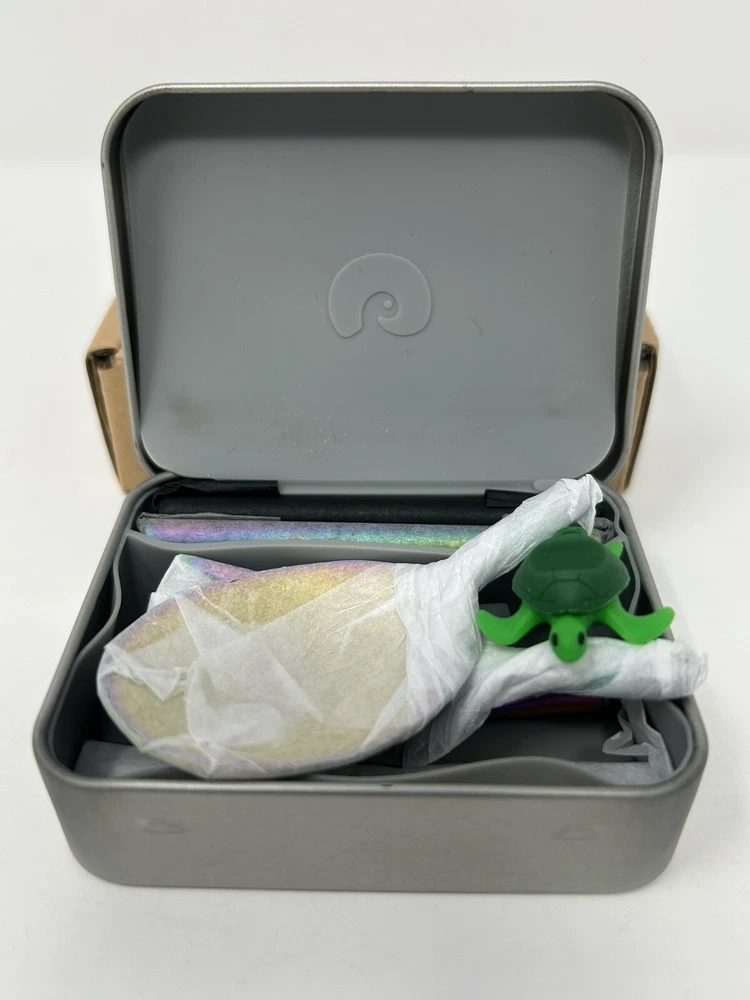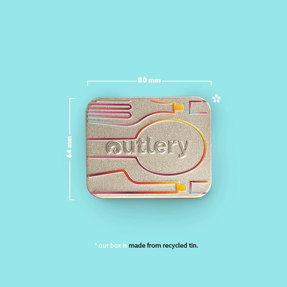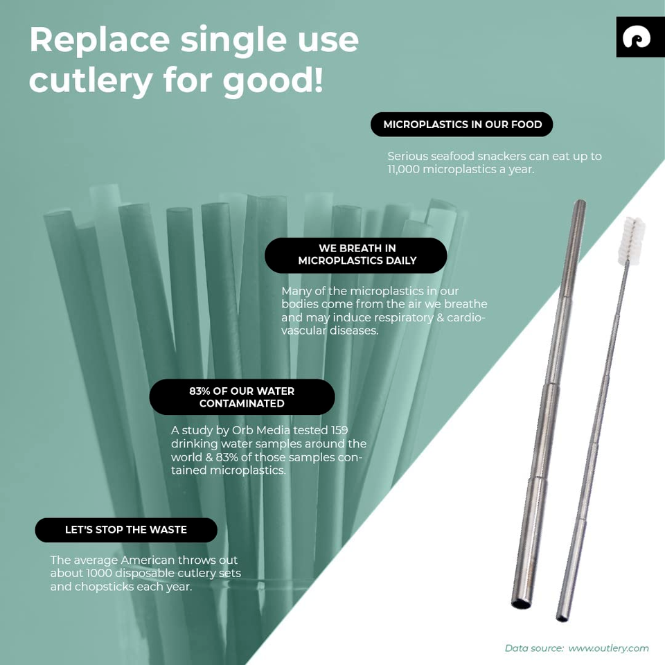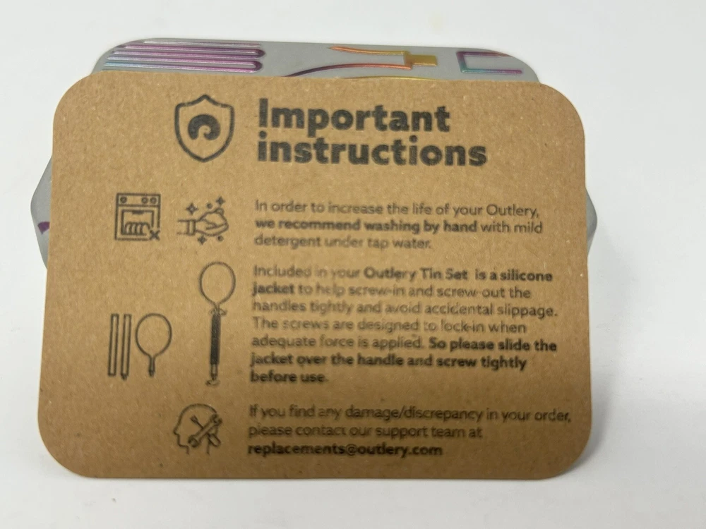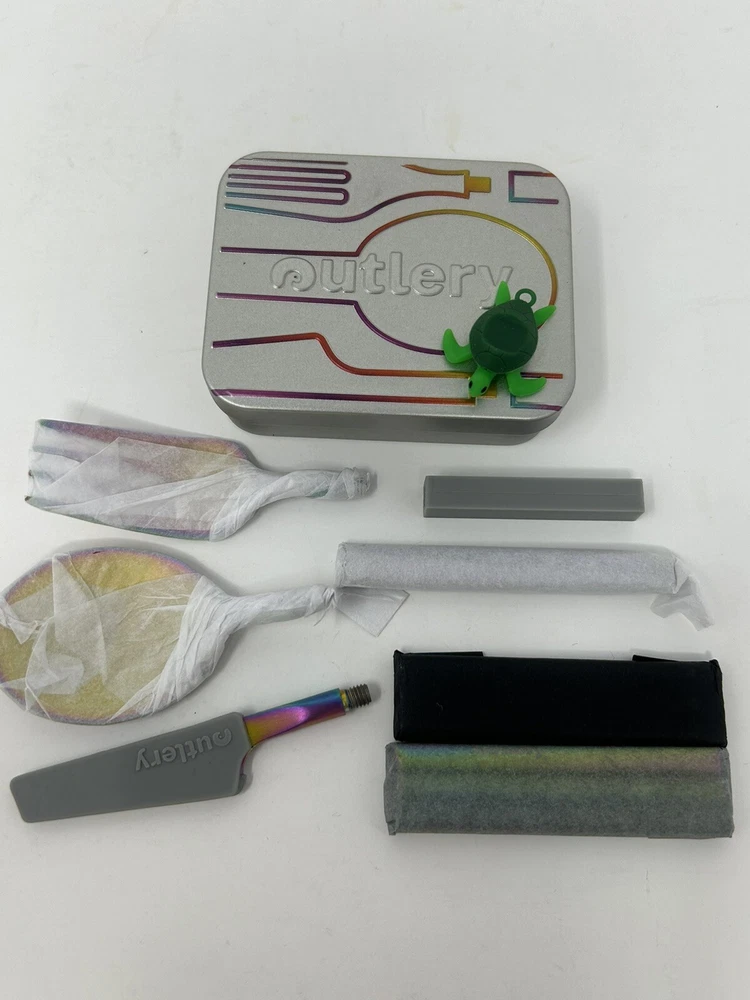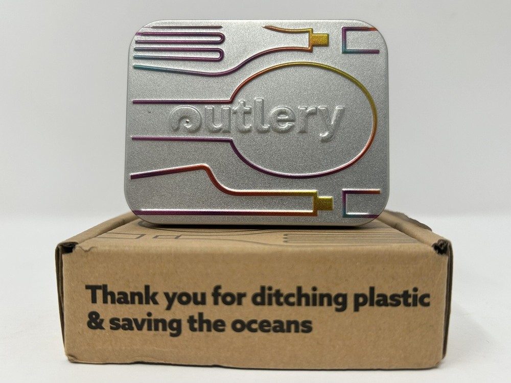 This NEW IN BOX collapsible Cutlery set includes Spoon, Fork, Knife, Straw, a cleaning tool and comes in a perfectly sized travel case. The cutlery is well made and stable, as the pieces screw together are designed to need the use of force to unscrew. This is the perfect travel cutlery set with case for your reusable cutlery for any type of trip!!! oh....and it's beautiful!!!!